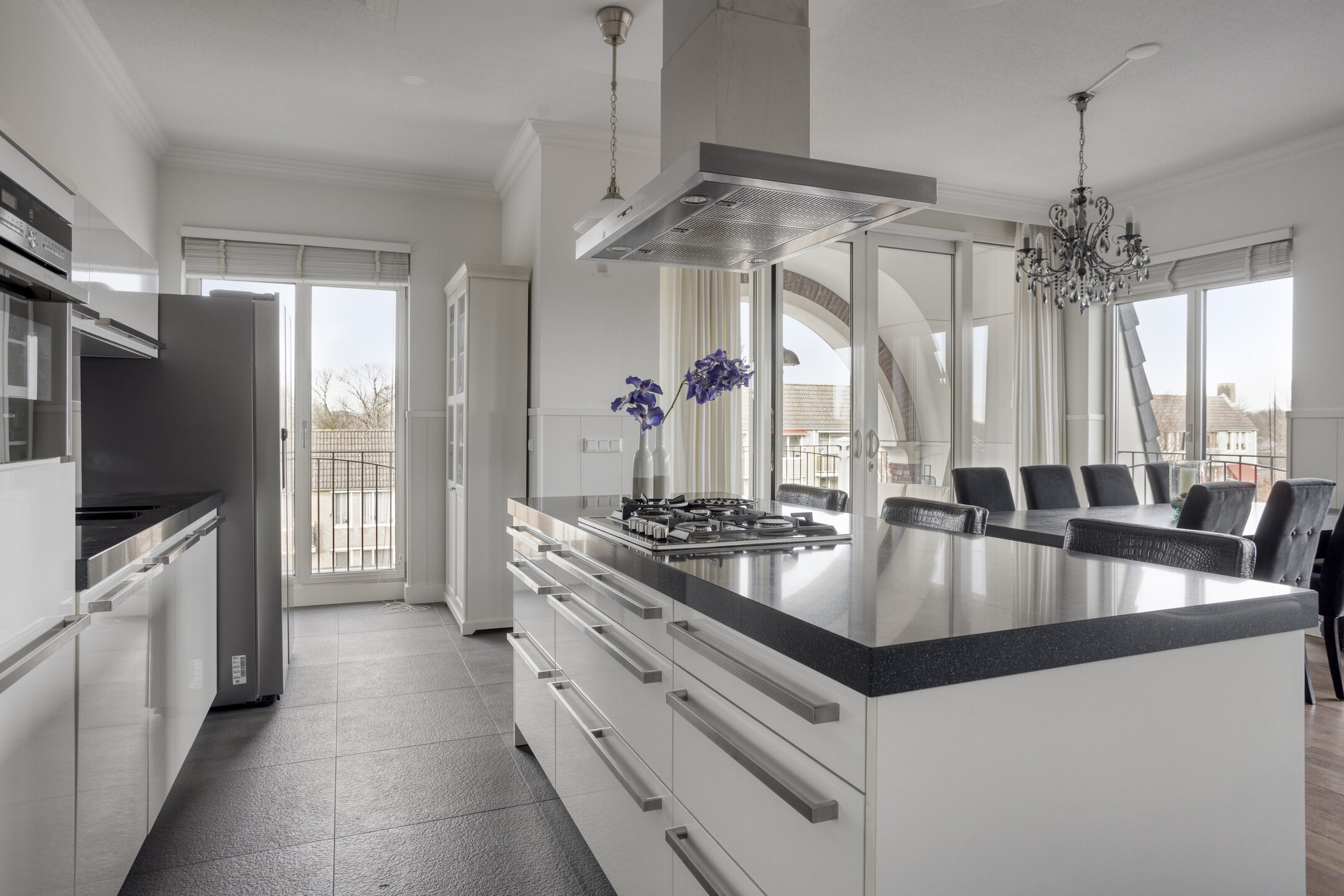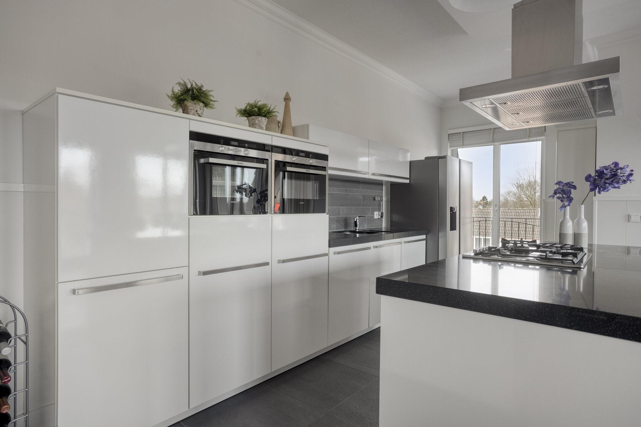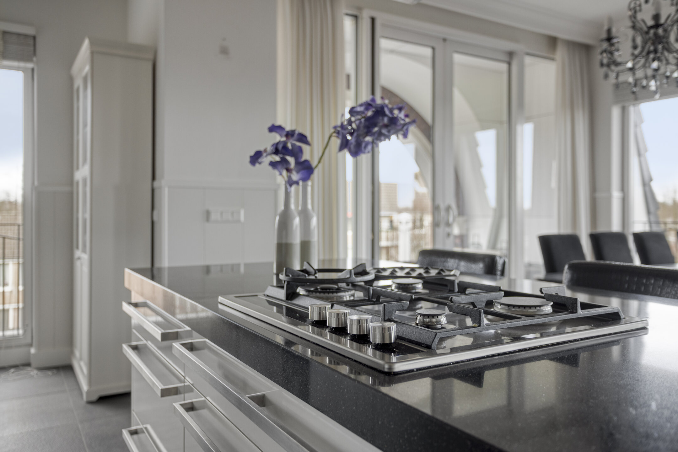 De open keuken in wandopstelling is uitgevoerd met luxe inbouwapparatuur. Dankzij de diverse inbouwapparatuur zoals een gaskookplateau, de vaatwasser, de koelkast, de combi-stoomoven en de combi-magnetron is deze keuken compleet en van alle gemakken voorzien. Het fraaie kookeiland met een mooi composiet werkblad beschikt over een gaskookplaat en fraaie, RVS afzuigkap. Diversen onder- en bovenkastjes zorgen voor voldoende bergruimte om al je keukengerei op te bergen!