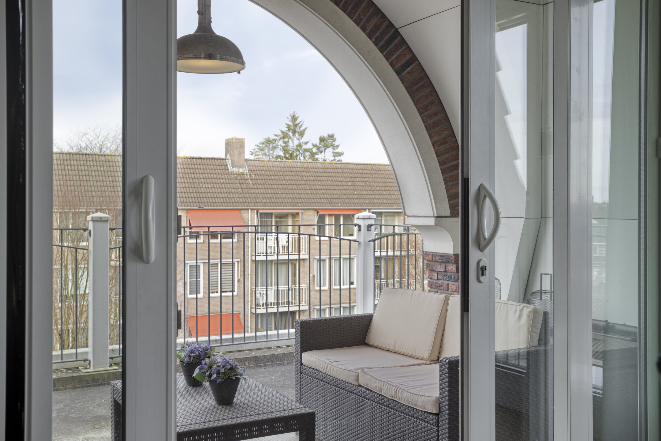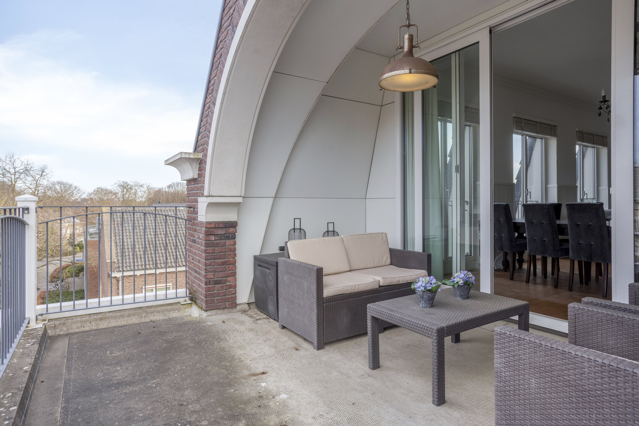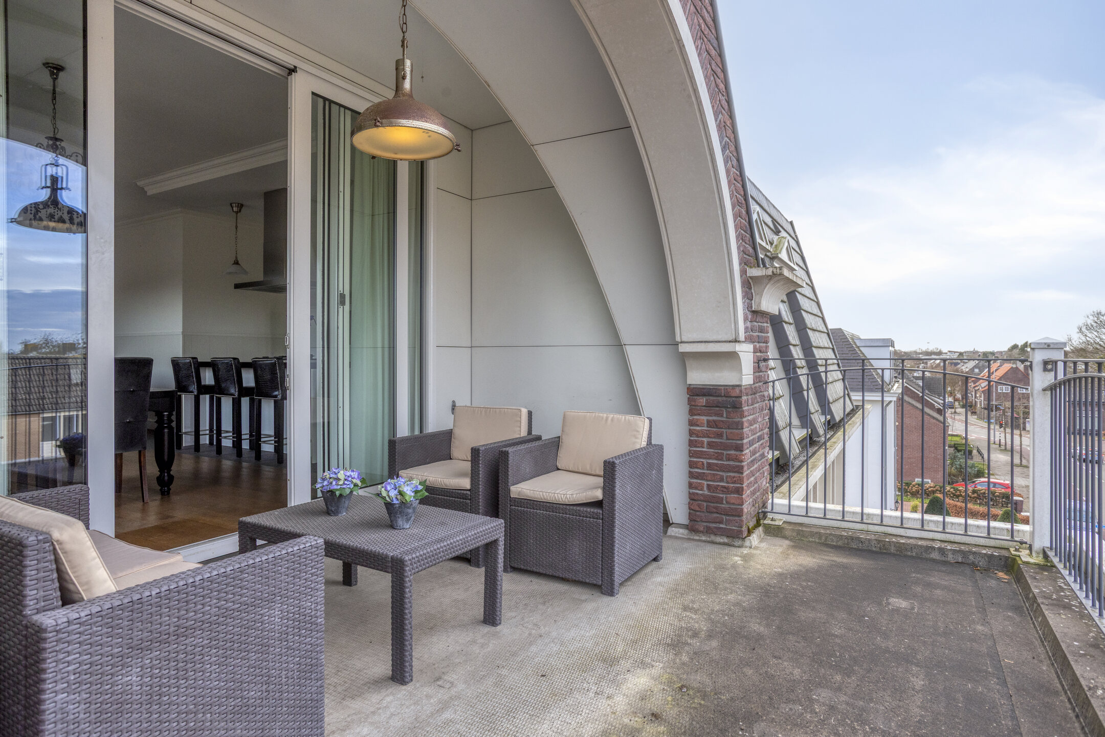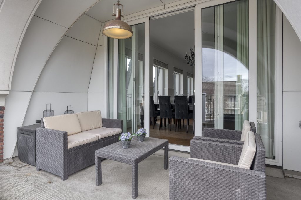 Het balkon biedt genoeg ruimte voor een loungehoek en een tafel.