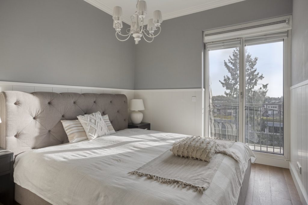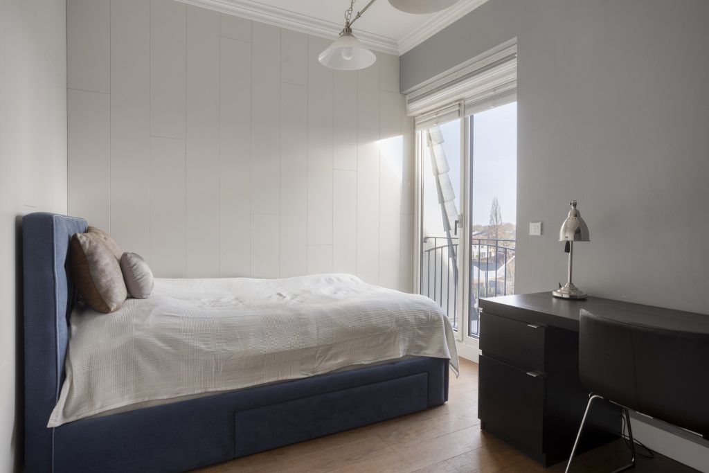 Ook in de slaapkamers valt je oog direct op de grote ramen, de natuurlijk lichtinval en het prachtige uitzicht op de parkachtige tuin. Alle slaapkamers zijn heerlijk licht en ruim. De slaapkamers beschikken over dezelfde afwerkingen en kwaliteiten als de rest van het appartement. In de twee grote kamers is voldoende ruimte voor het plaatsen van een tweepersoonsbed en kast. De kleinste slaapkamer heeft een kamerhoge inbouw ledingkast met kledingliften.