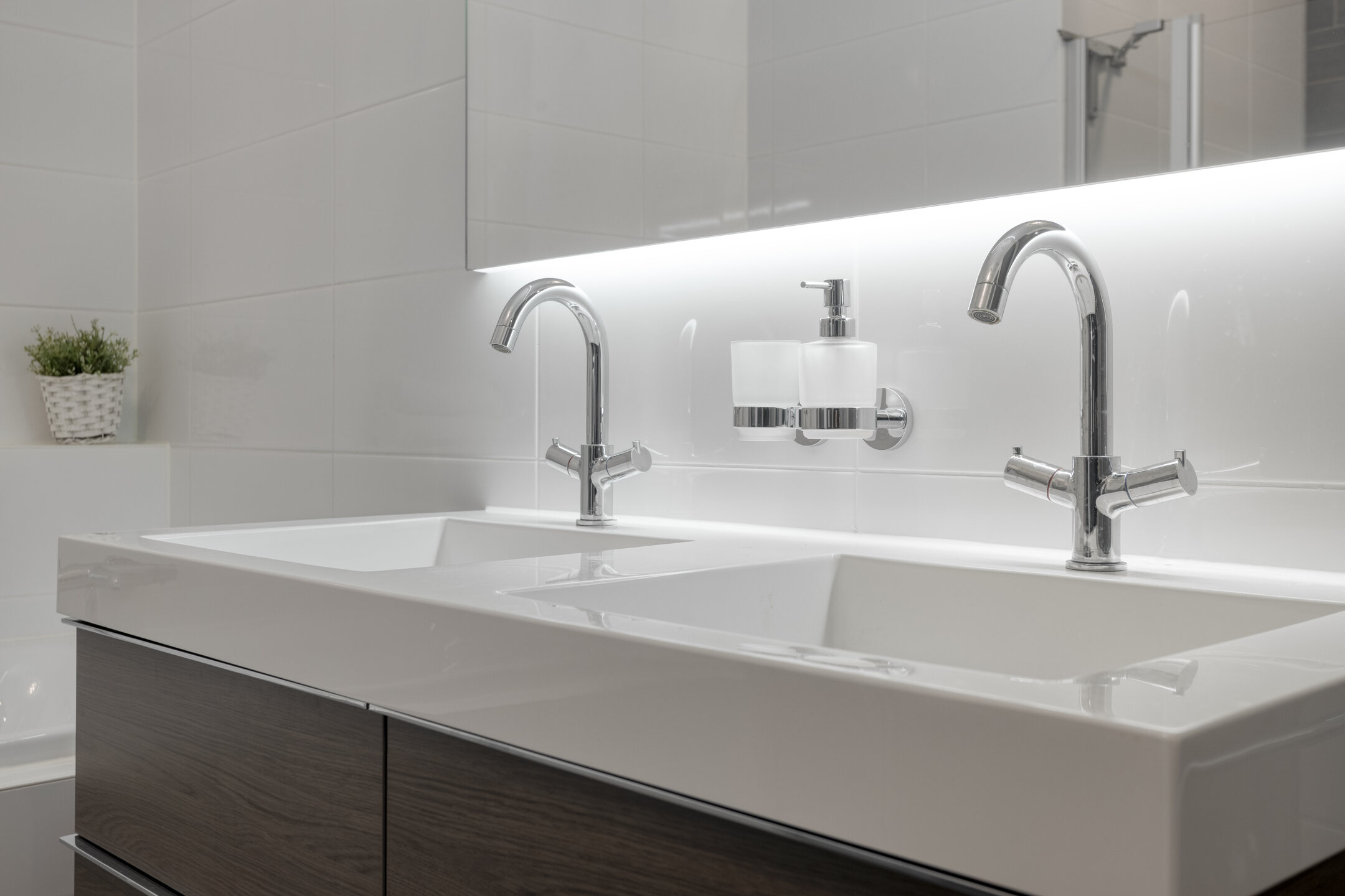 Bij binnenkomst valt het ligbad (bubbelbad) direct op. Er is gekozen voor een combinatie tussen donker- en lichte tegels. De badkamer heeft een royaal badmeubel aan de wand welke is voorzien van twee kranen en praktische laden. Er is een hele ruime inloopdouche gecreëerd met zowel een rainshower- als een handdouche. Tevens is er mechanische ventilatie aanwezig om de badkamer heerlijk te ventileren. Diverse inbouwspots, de verwarmende spiegel én de vloerverwarming maken deze badkamer bijzonder compleet.