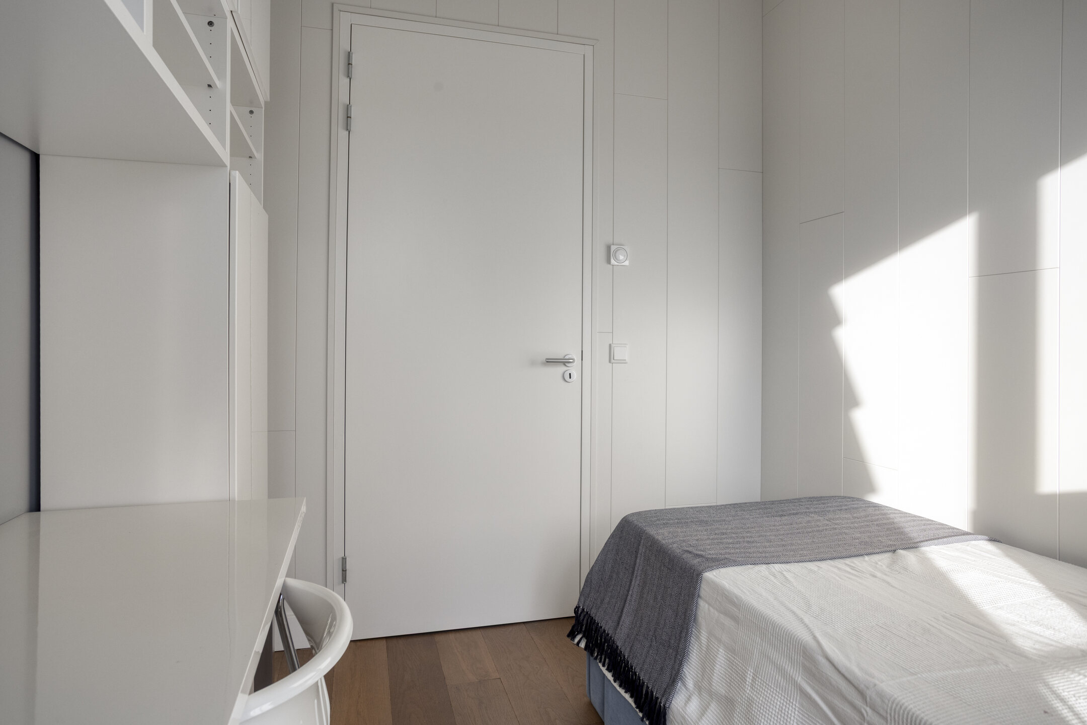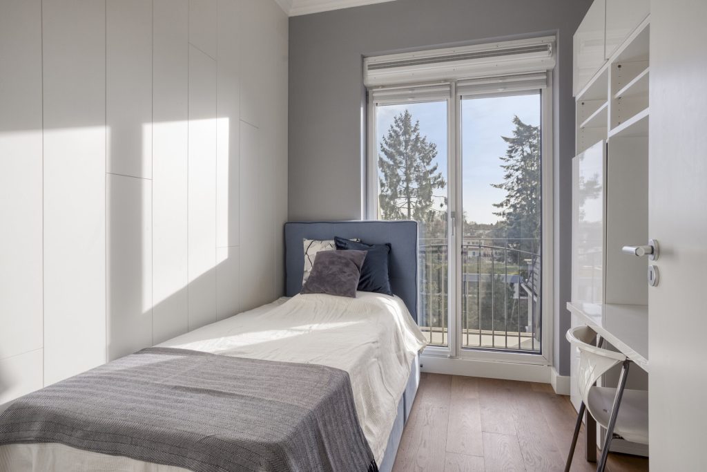 In the bedrooms, too, you’ll immediately notice the large windows, the natural light, and the beautiful view of the park-like garden. All bedrooms are wonderfully bright and spacious. They feature the same finishes and quality as the rest of the apartment. The two large rooms offer ample space for a double bed and a wardrobe. The smallest bedroom features a floor-to-ceiling built-in wardrobe with clothes lifts.