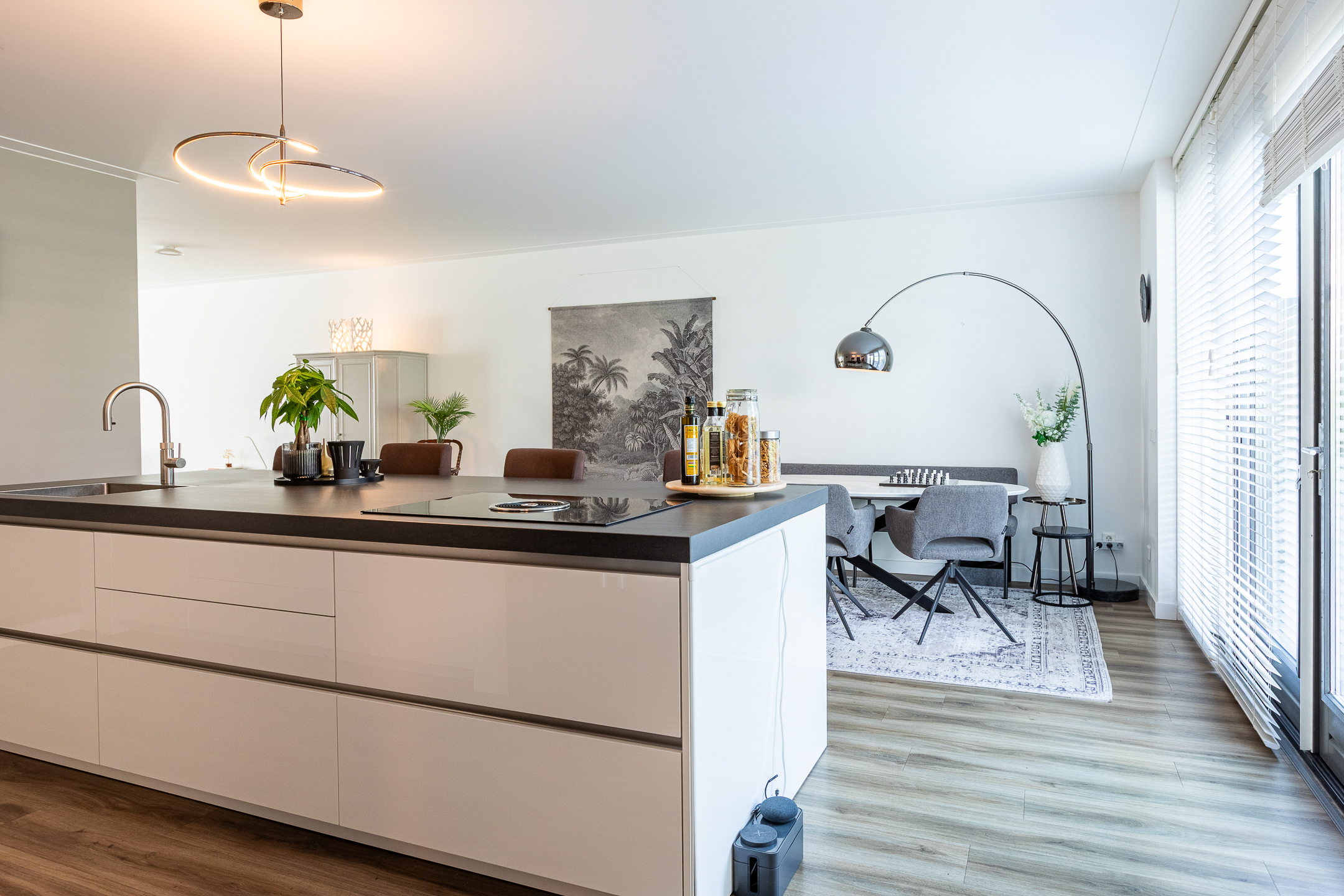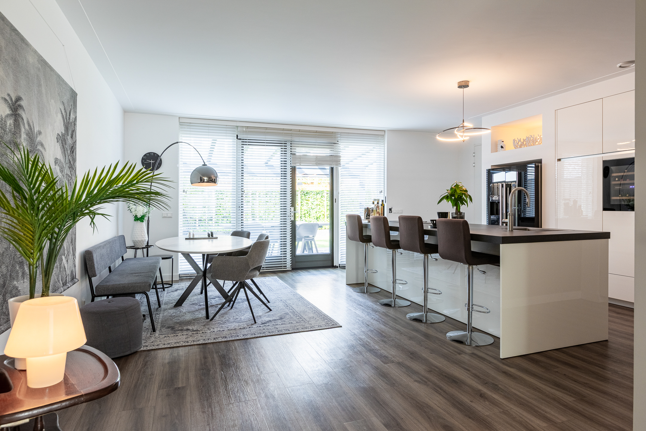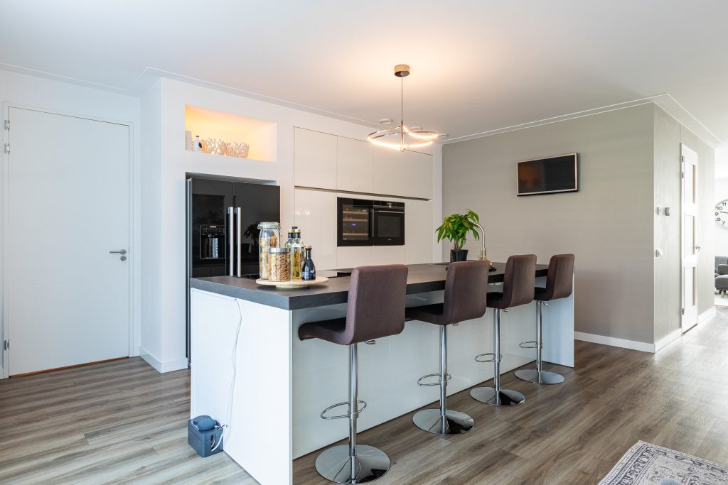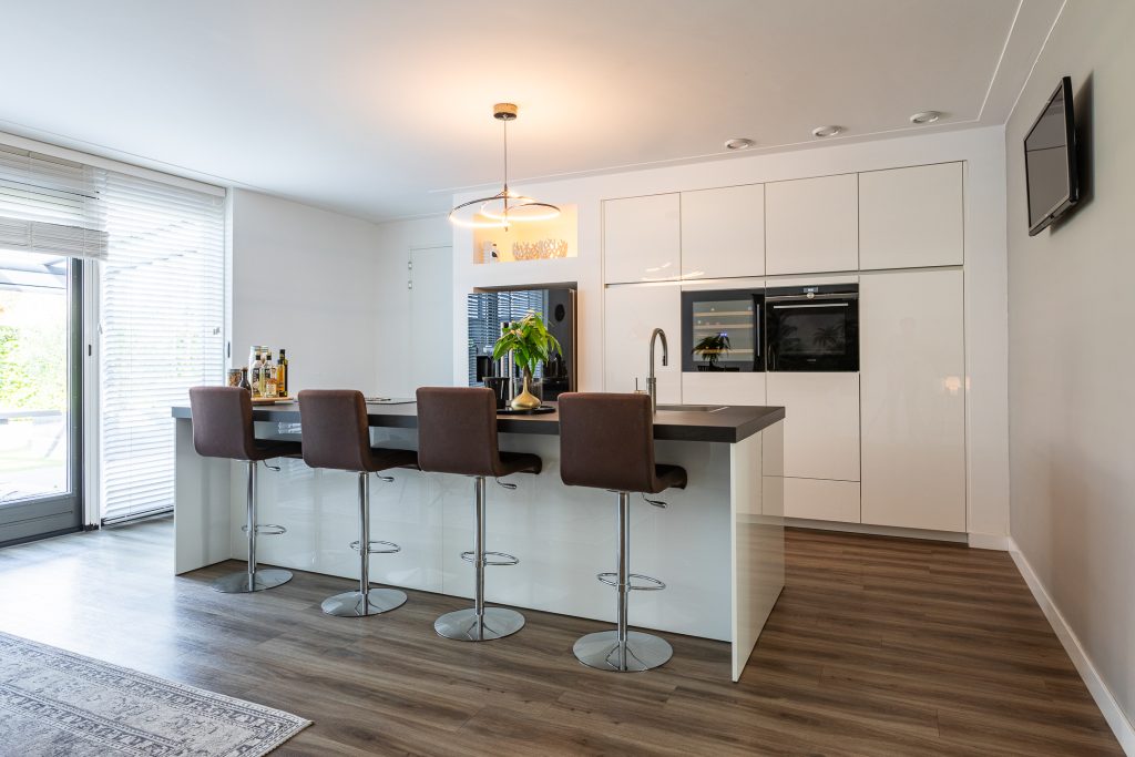 Het leefgedeelte is riant opgezet en voelt dankzij de hoge plafonds en hoge deuren extra ruim en licht. Aan de voorzijde tref je de woonkamer met prachtig uitzicht over het bos. Aan de achterzijde bevindt zich de woonkeuken – een echte eyecatcher! De luxe keuken is op maat gerealiseerd door Van Diessen keukens en voorzien van een kookeiland, een kastenwand en hoogwaardige inbouwapparatuur zoals Bora inductie kookplaat, Quooker, wijnklimaatkast, combi oven/stoomoven en vaatwasser.