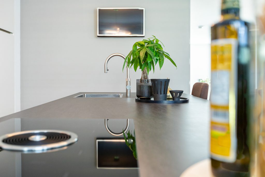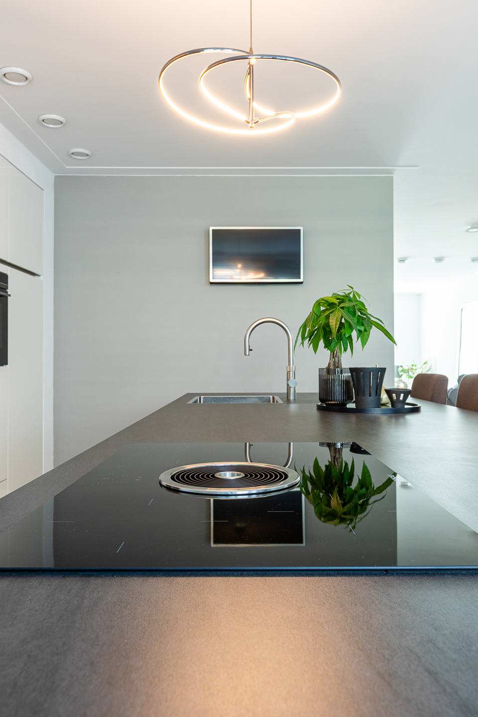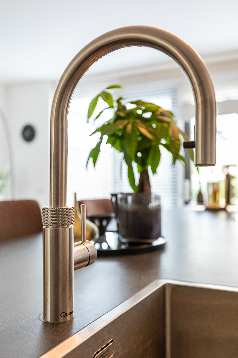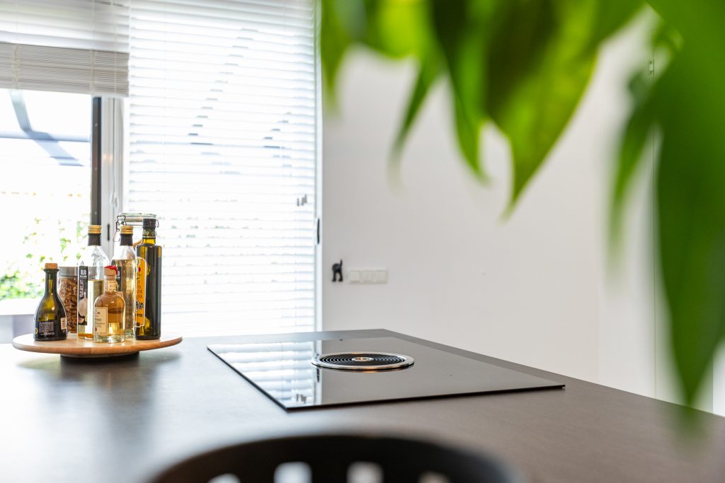 Het leefgedeelte is riant opgezet en voelt dankzij de hoge plafonds en hoge deuren extra ruim en licht. Aan de voorzijde tref je de woonkamer met prachtig uitzicht over het bos. Aan de achterzijde bevindt zich de woonkeuken – een echte eyecatcher! De luxe keuken is op maat gerealiseerd door Van Diessen keukens en voorzien van een kookeiland, een kastenwand en hoogwaardige inbouwapparatuur zoals Bora inductie kookplaat, Quooker, wijnklimaatkast, combi oven/stoomoven en vaatwasser.