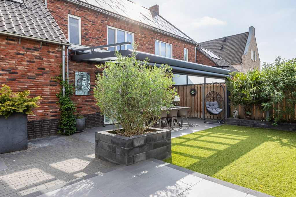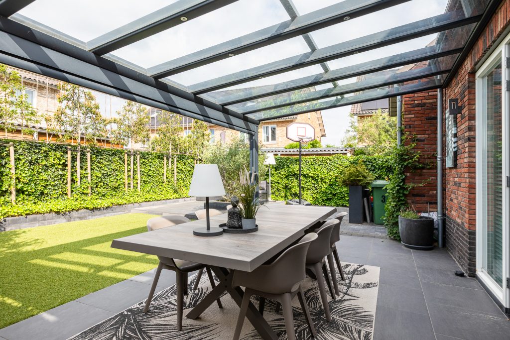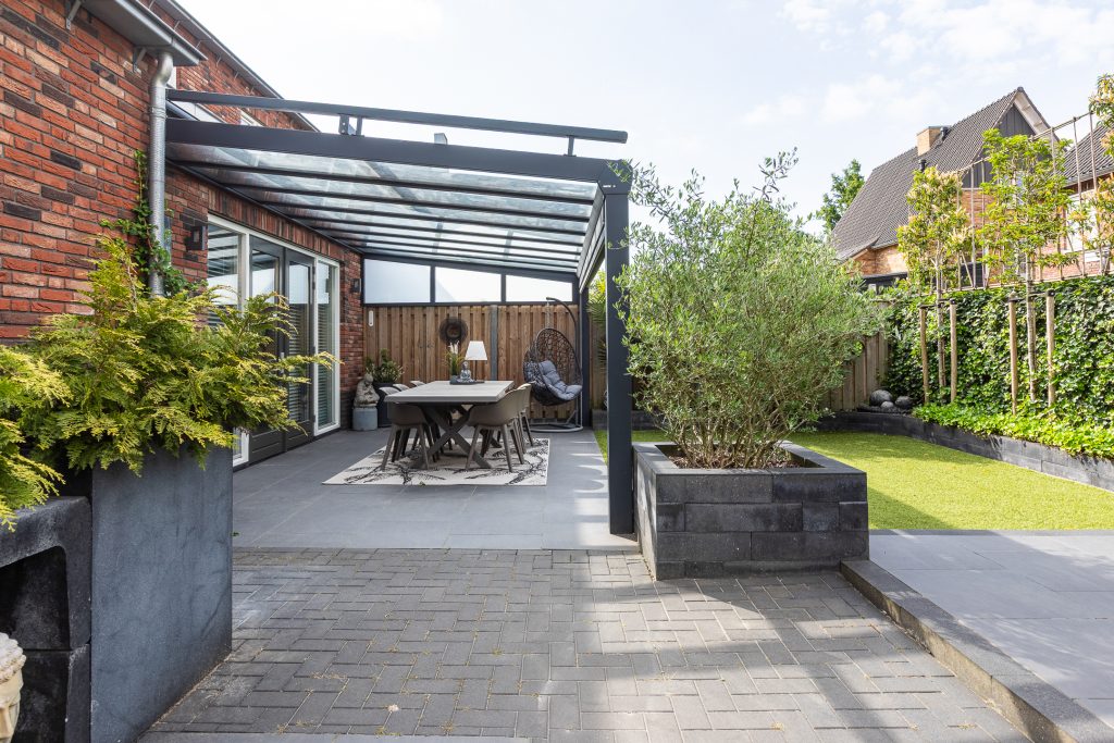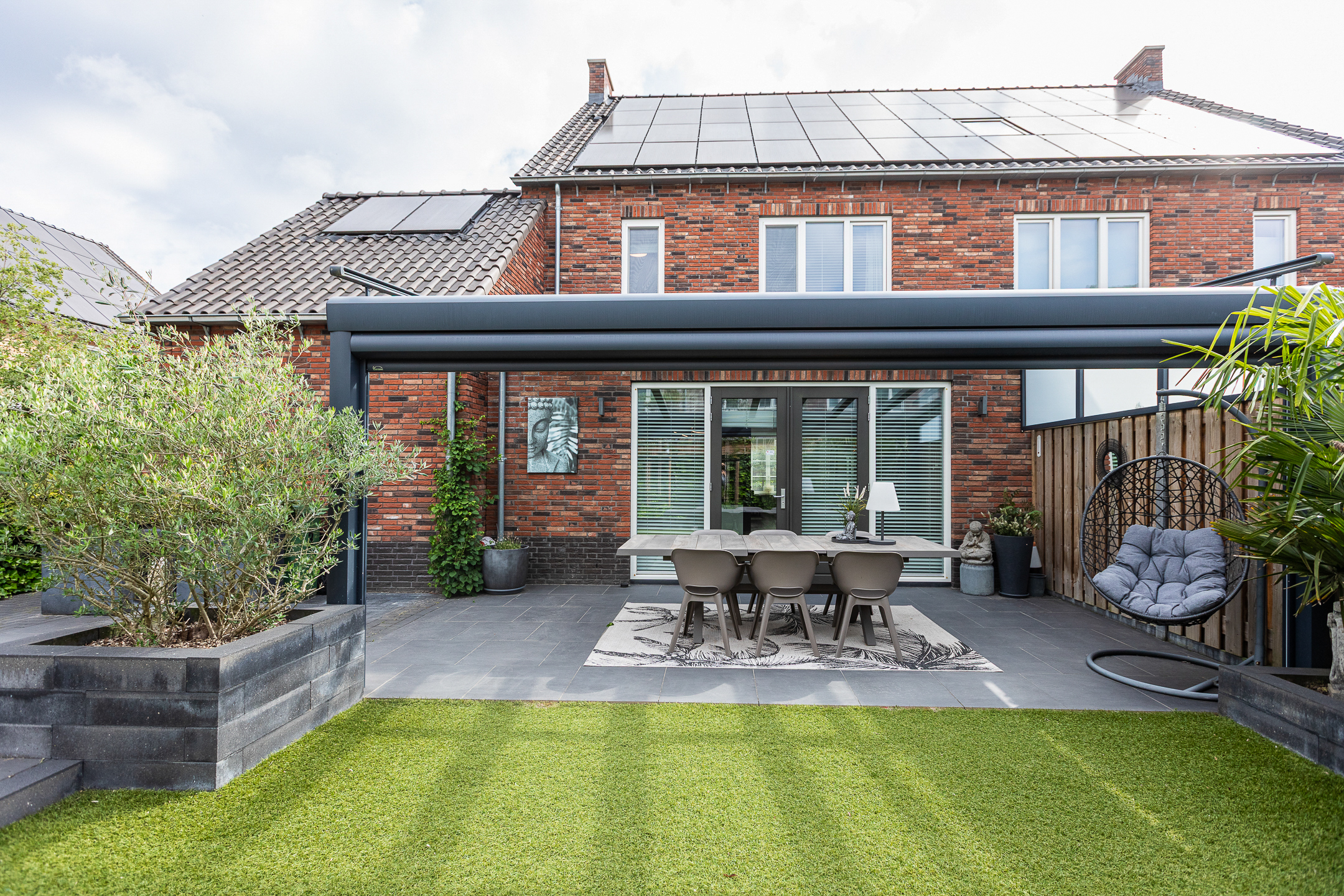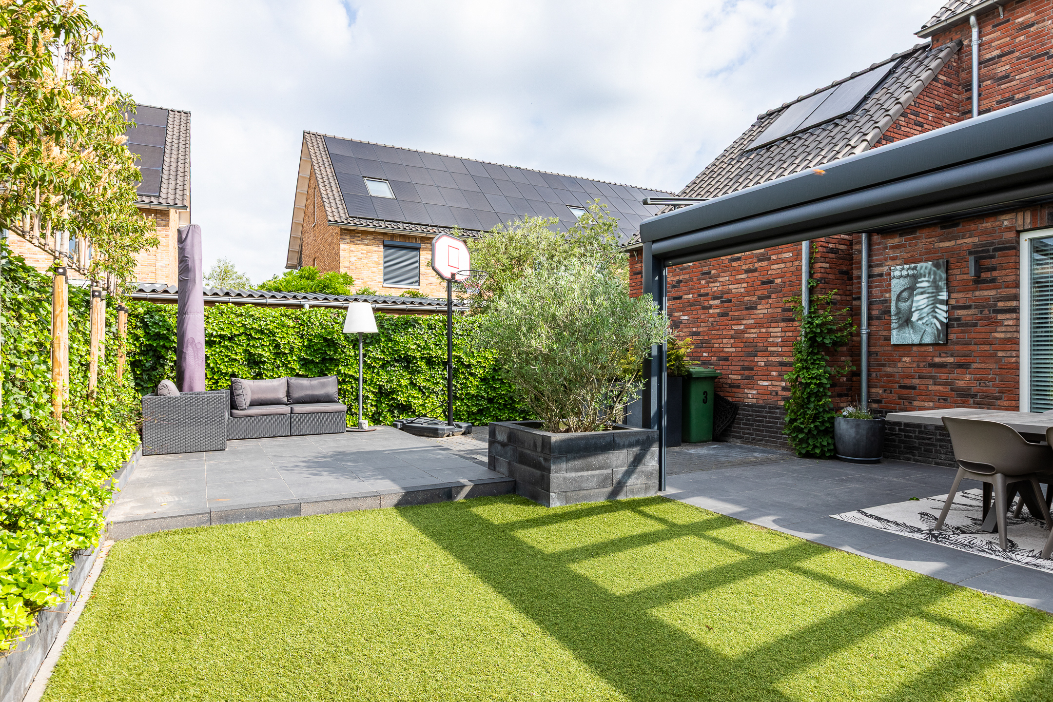 The southwest-facing rear garden is attractively designed with a lawn, planting borders and two lovely terraces. One of the terraces is covered with a modern aluminium roof, equipped with sun shading on both the top and the sides – ideal for every season.