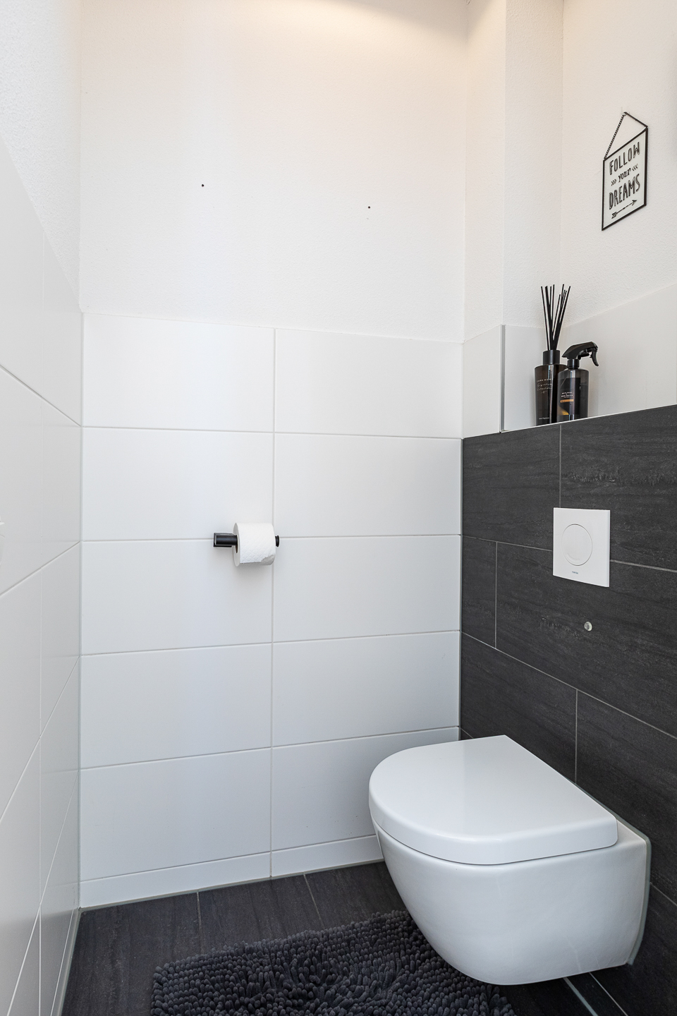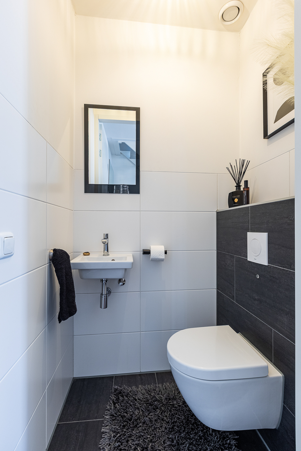 From the spacious driveway with room for several cars, you enter the house. The generous hallway includes the staircase to the first floor, the modern toilet, a heating/technical room with the heat-pump installation, and the meter cupboard.