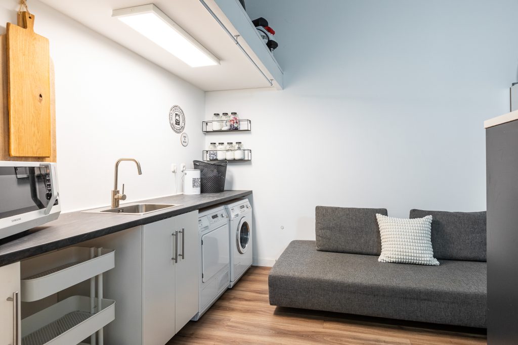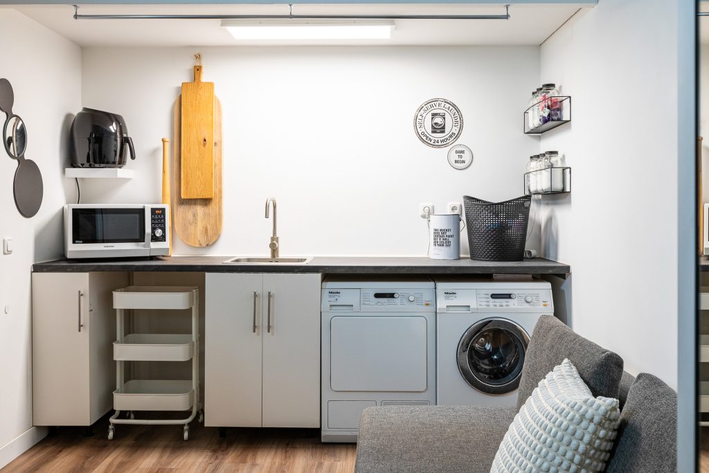 Via de keuken is er toegang tot de praktische bijkeuken met een pantry en aansluitingen voor wasmachine en droger. Tevens voldoende ruimte voor het bergen van spullen of het stallen van de fietsen. Vanuit de keuken openen dubbele deuren naar het overdekte terras, perfect voor lange zomeravonden.