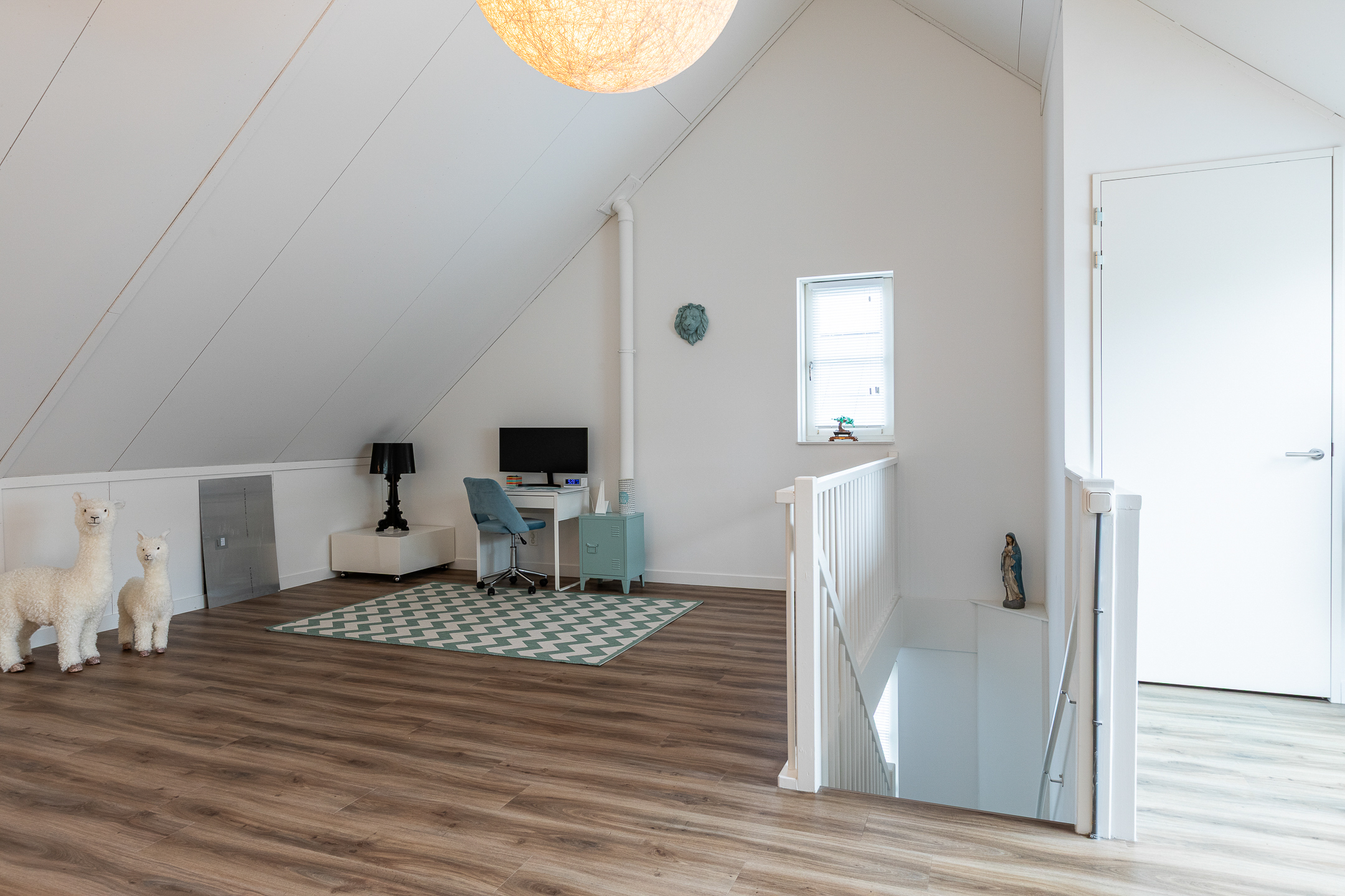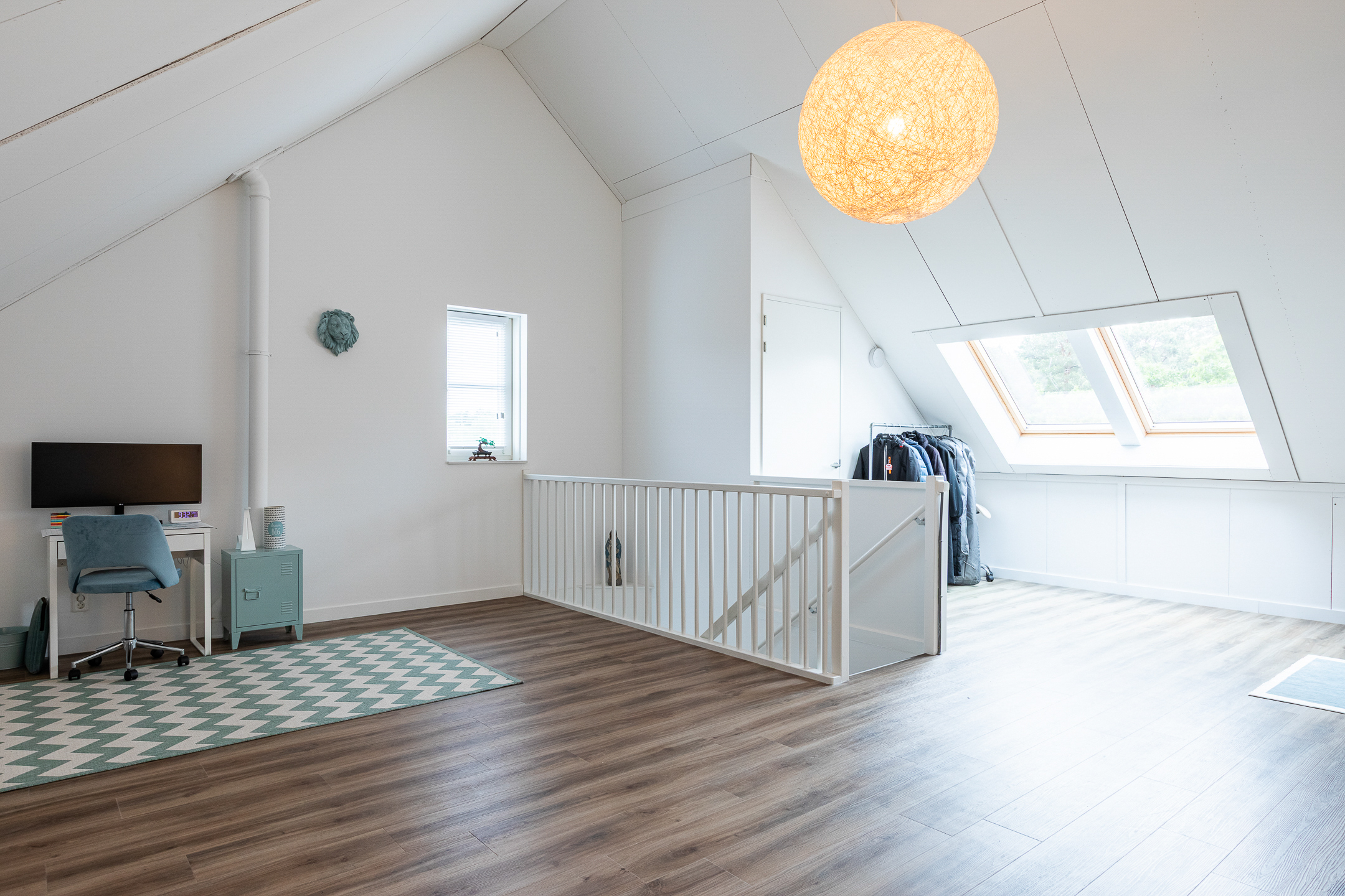 De zolderverdieping is indrukwekkend in omvang en biedt volop ruimte voor verdere indeling – denk aan een of twee extra slaapkamers, werkruimte of hobbykamer. Voor een juiste indruk zijn visuals/ impressies meegenomen in de presentatie. Twee dakramen aan de voorzijde zorgen voor natuurlijke lichtinval. Verder vind je hier een afgesloten technische ruimte met de WTW-installatie en veel bergruimte achter de knieschotten.