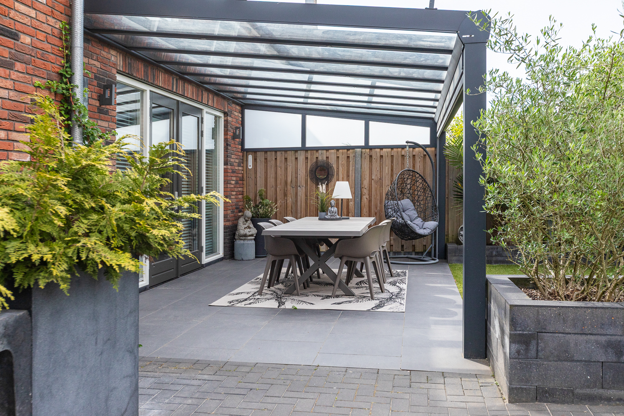 De voortuin is strak en onderhoudsvriendelijk aangelegd, met een oprit voor meerdere voertuigen en een achterom. De achtertuin (gelegen op het zuidwesten) is sfeervol vormgegeven met een gazon, plantenborders en twee heerlijke terrassen. Eén van de terrassen is overdekt met een moderne aluminium overkapping, voorzien van zonwering aan zowel de bovenzijde als zijkant – ideaal voor ieder seizoen.
