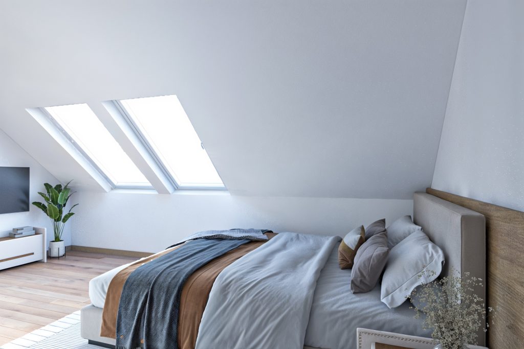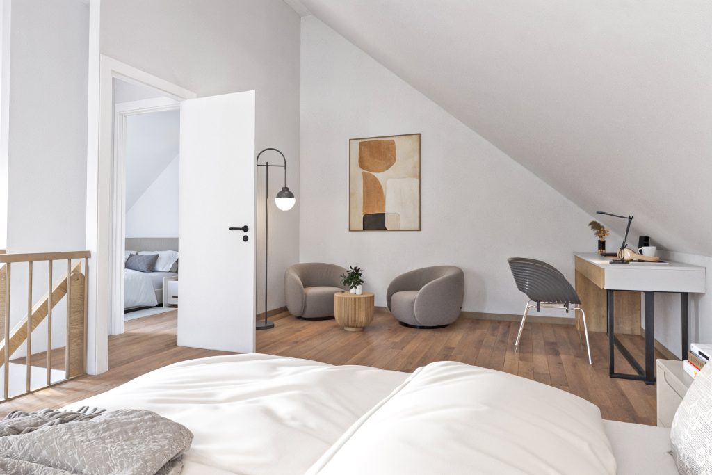 The attic floor is impressive in size and offers plenty of options for further layout – for example, one or two additional bedrooms, a workspace or hobby room. Visual impressions are included in the presentation. Two skylights at the front provide natural daylight.