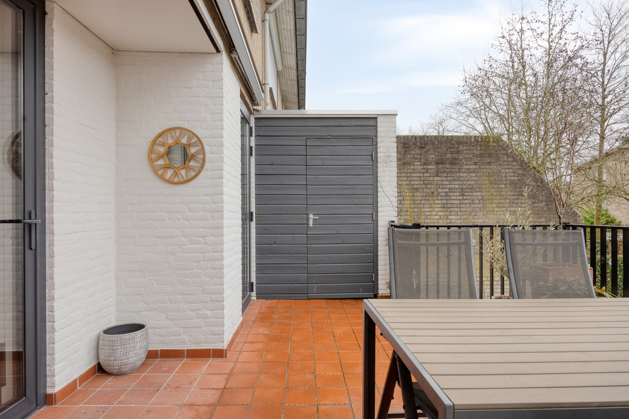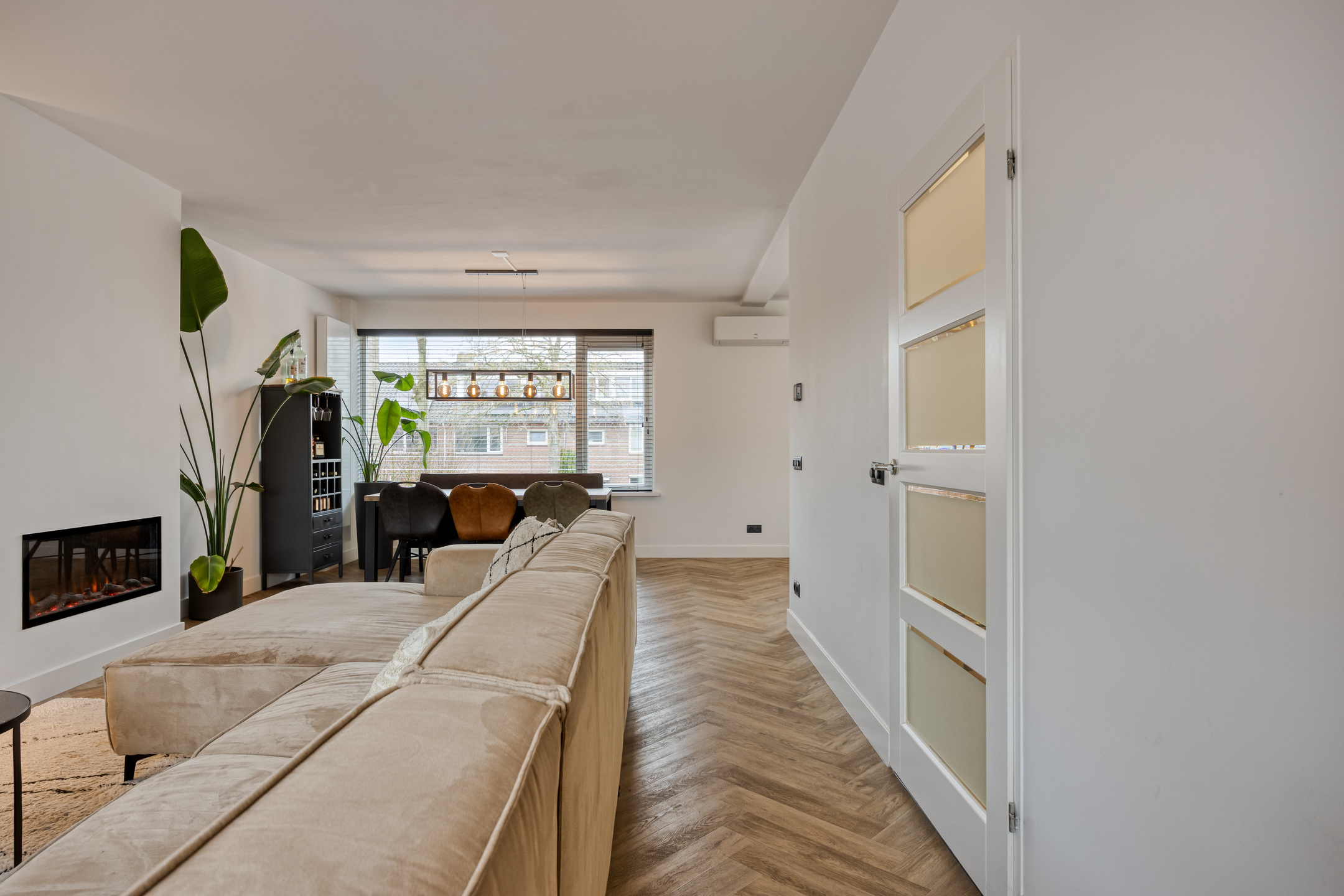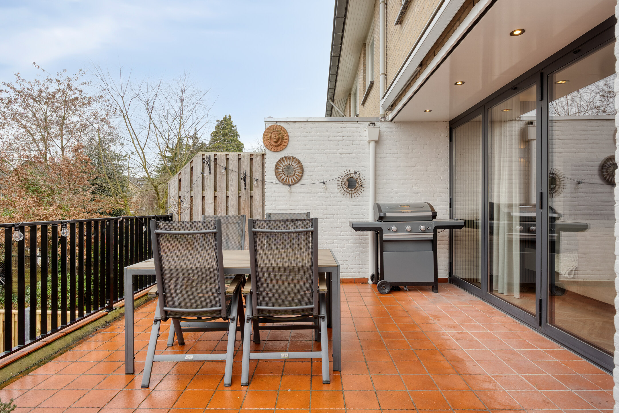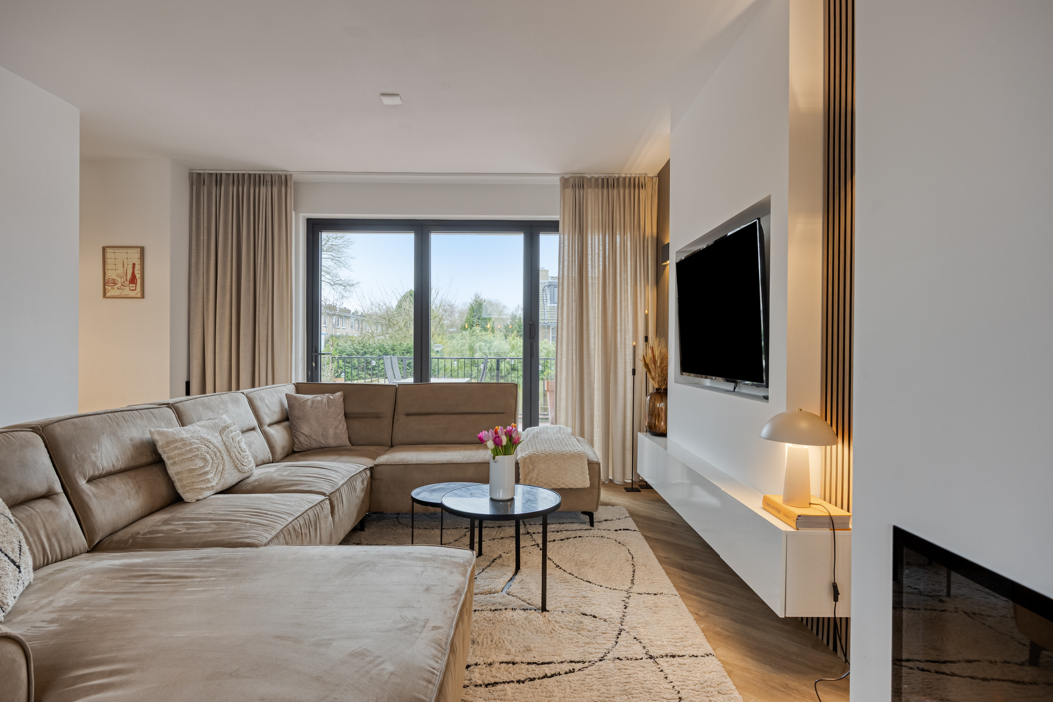 Zeer riante, sfeervolle en lichte L-vormige living met het lounge gedeelte opgesteld aan de achterzijde van de woonkamer, met een zeer gezellige elektrische sfeerhaard (rookkanaal is nog in tact), airconditioning (2023) en een harmonica schuifdeur waardoor je ook meteen toegang hebt tot het gezellige ruime, deels overdekte balkon/terras met zonneluifel. Men kan hier al vroeg genieten van het voorjaar. Het balkon/terras is ruim en beschikt over een extra berging en trap naar de achtertuin.
