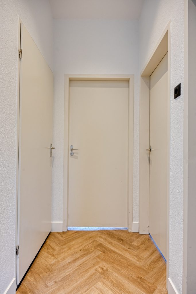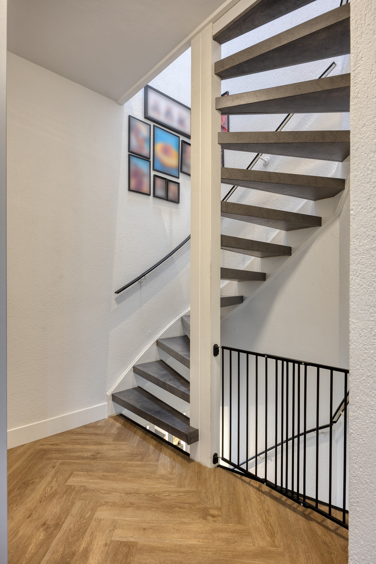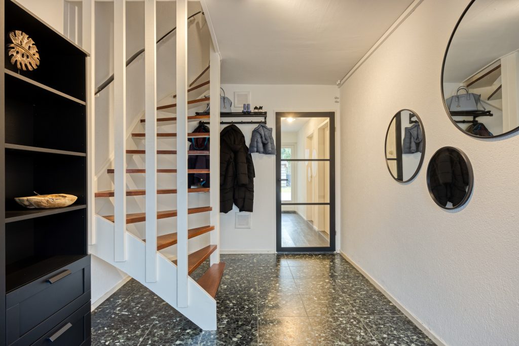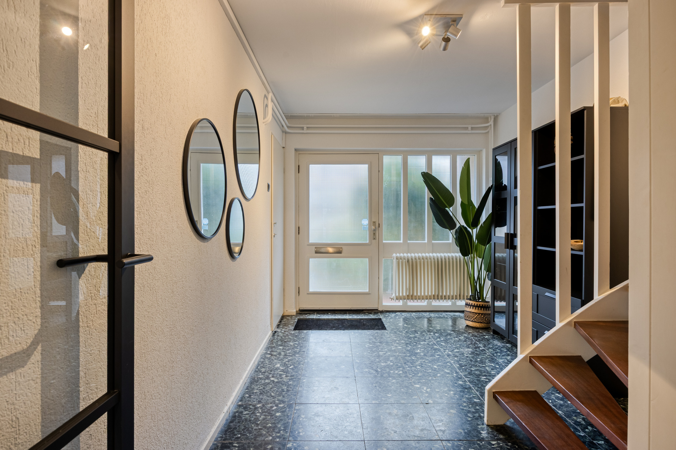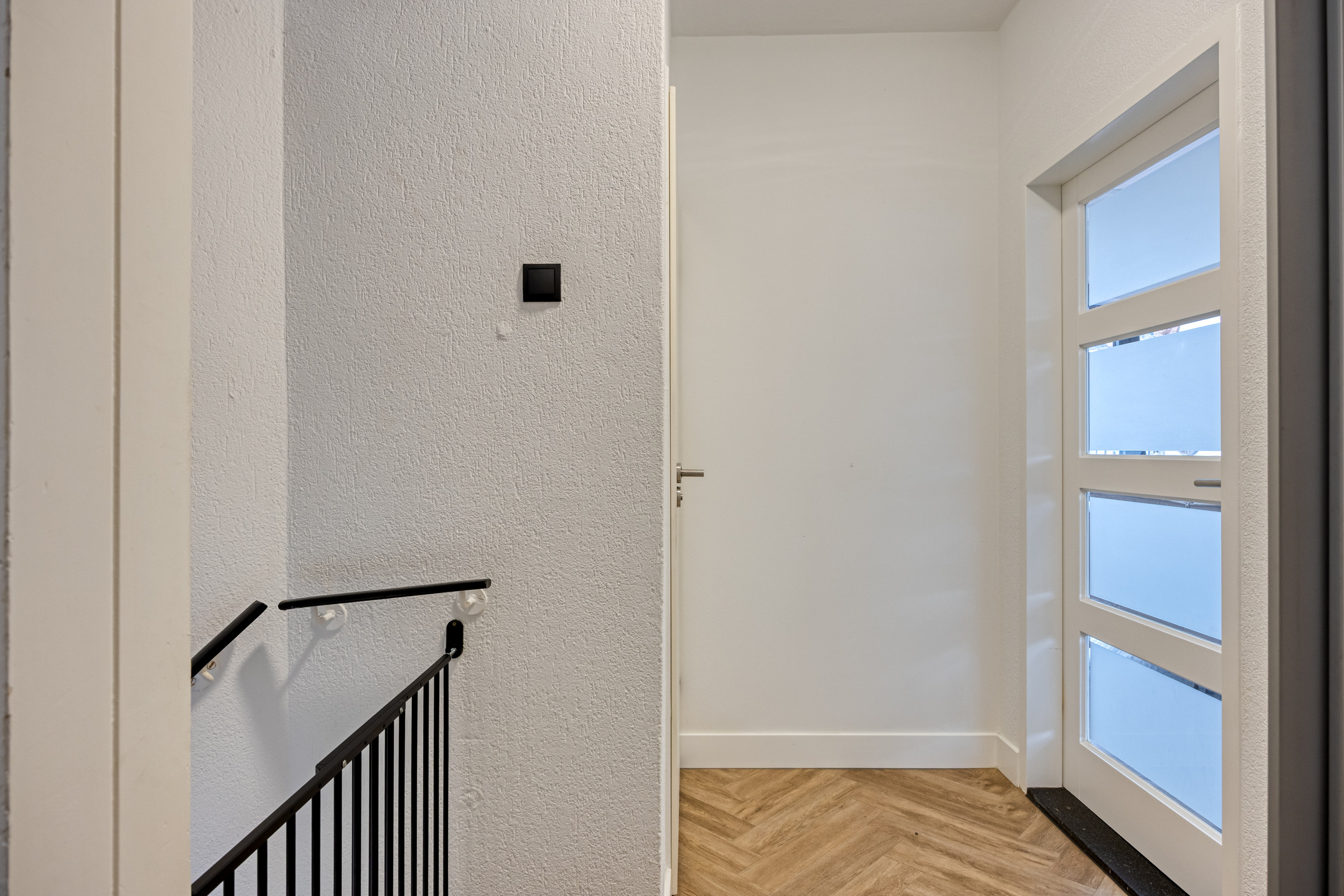 Royale hal met garderoberuimte, trapopgang en meterkast. Een stalen deur geeft toegang tot de tweede hal.