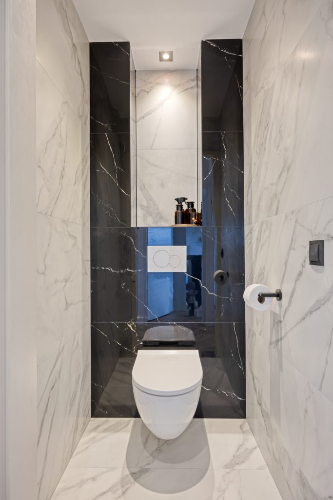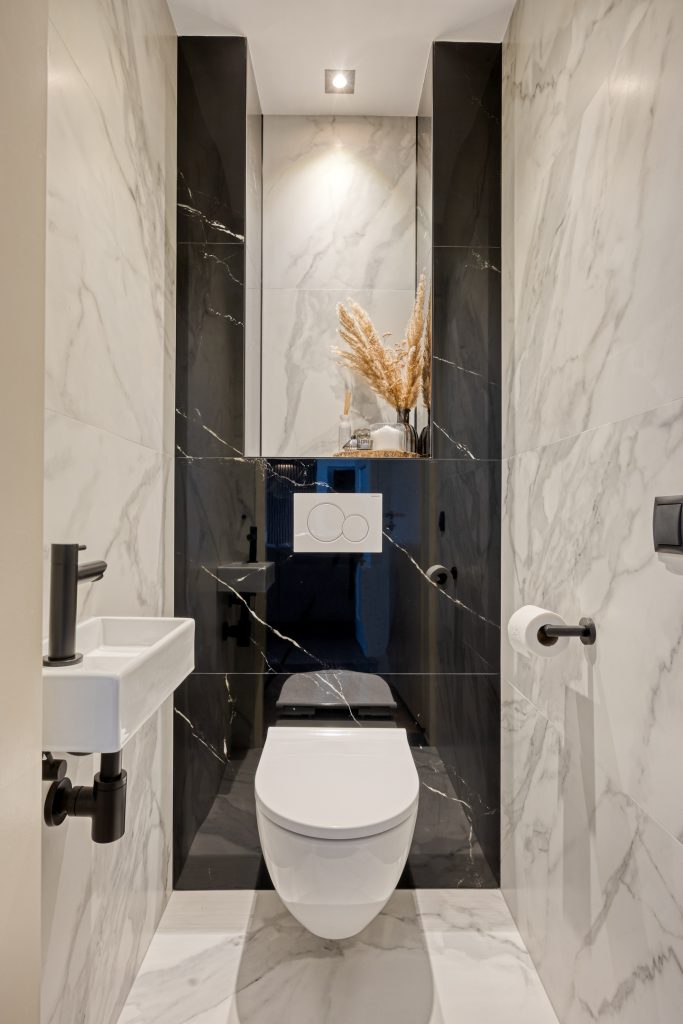 Luxe uitgevoerde, geheel met marmer betegelde toiletruimte met wandcloset.