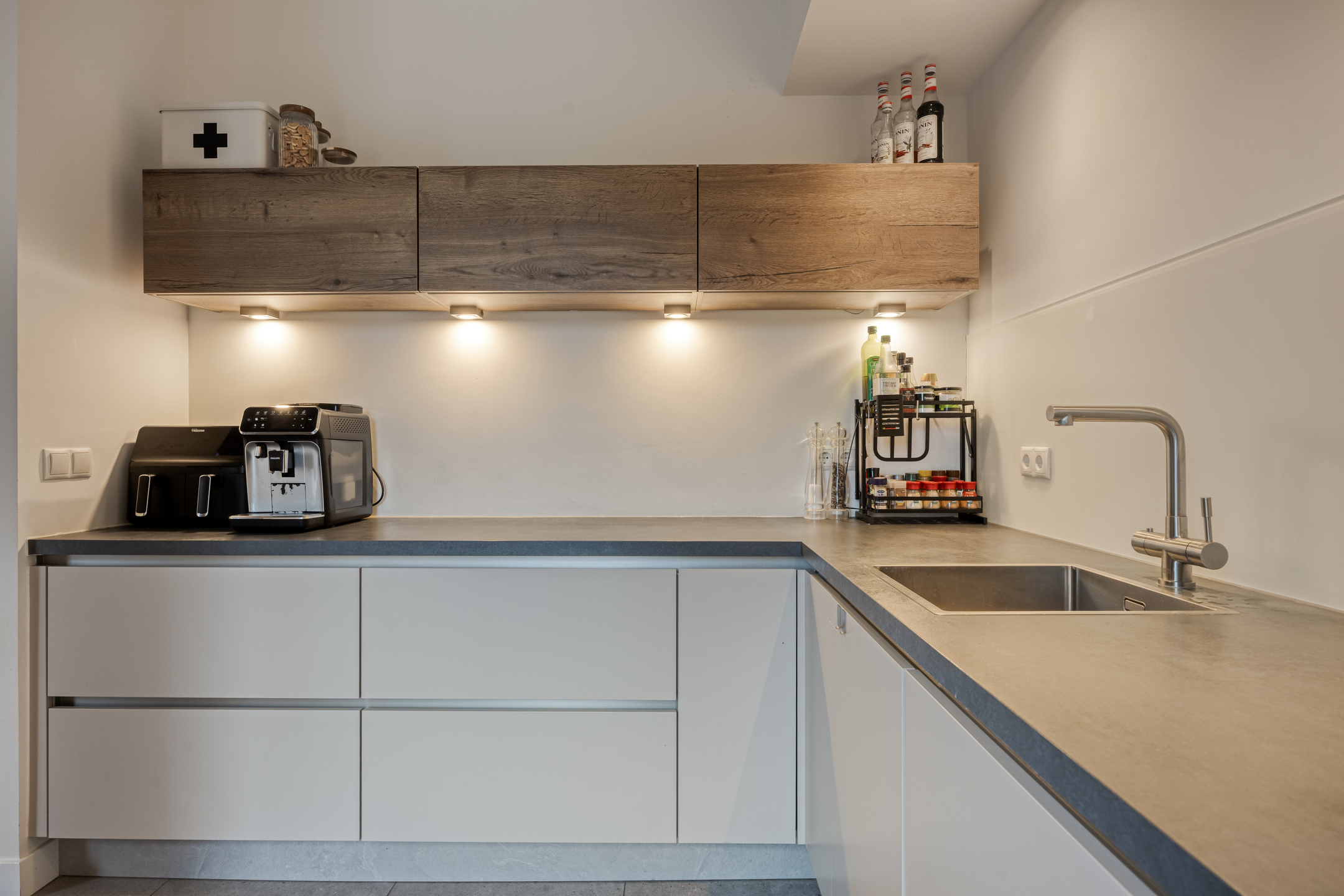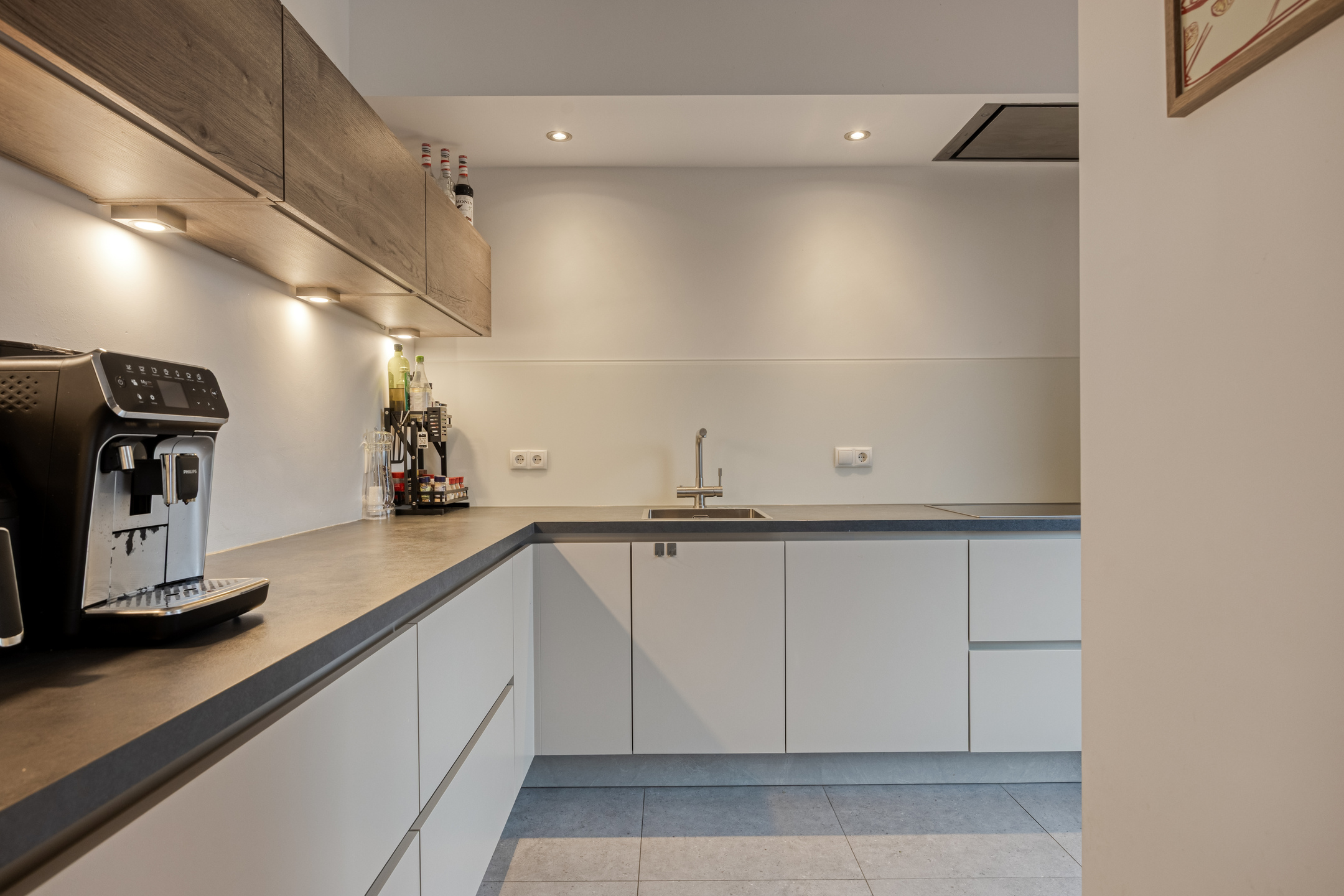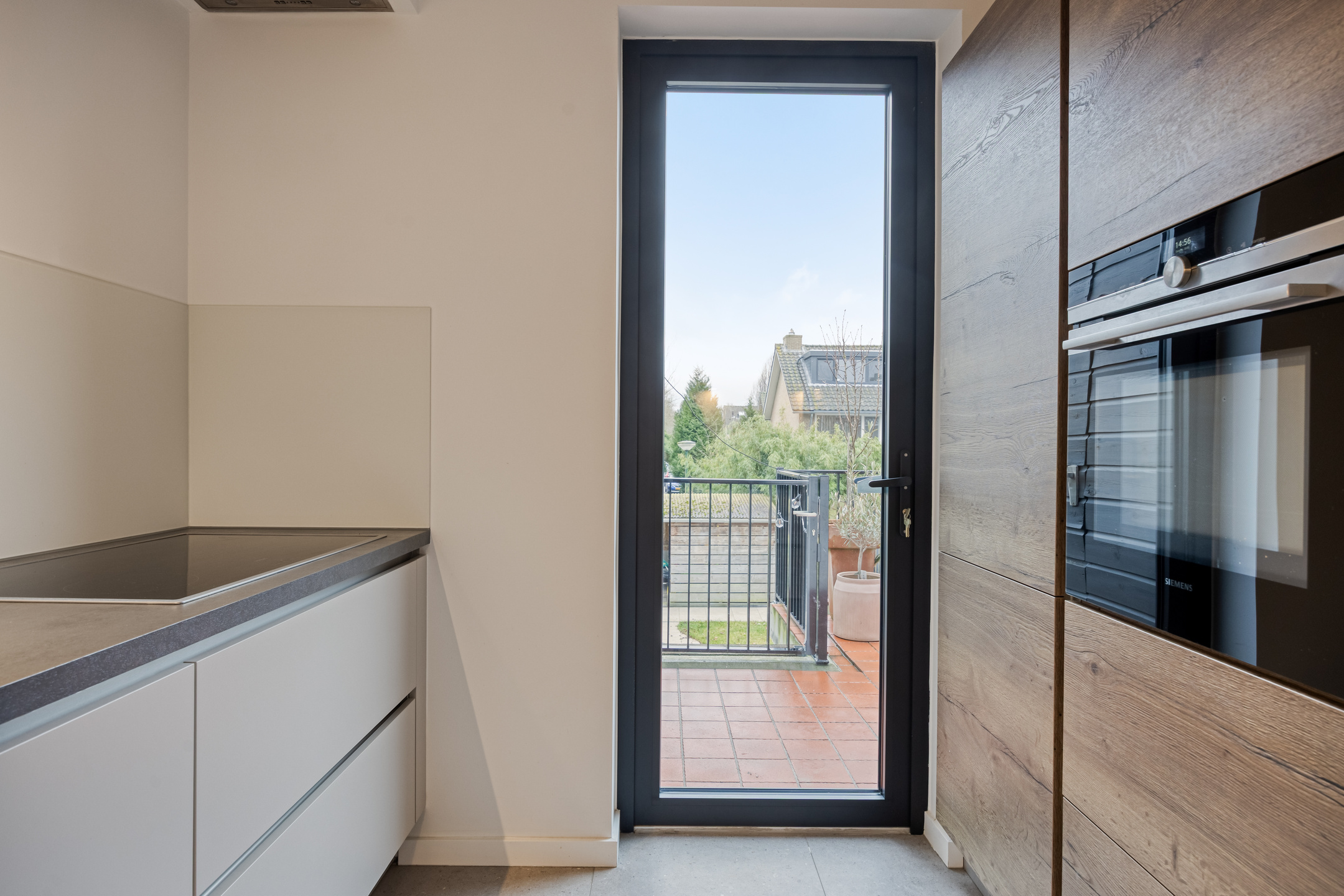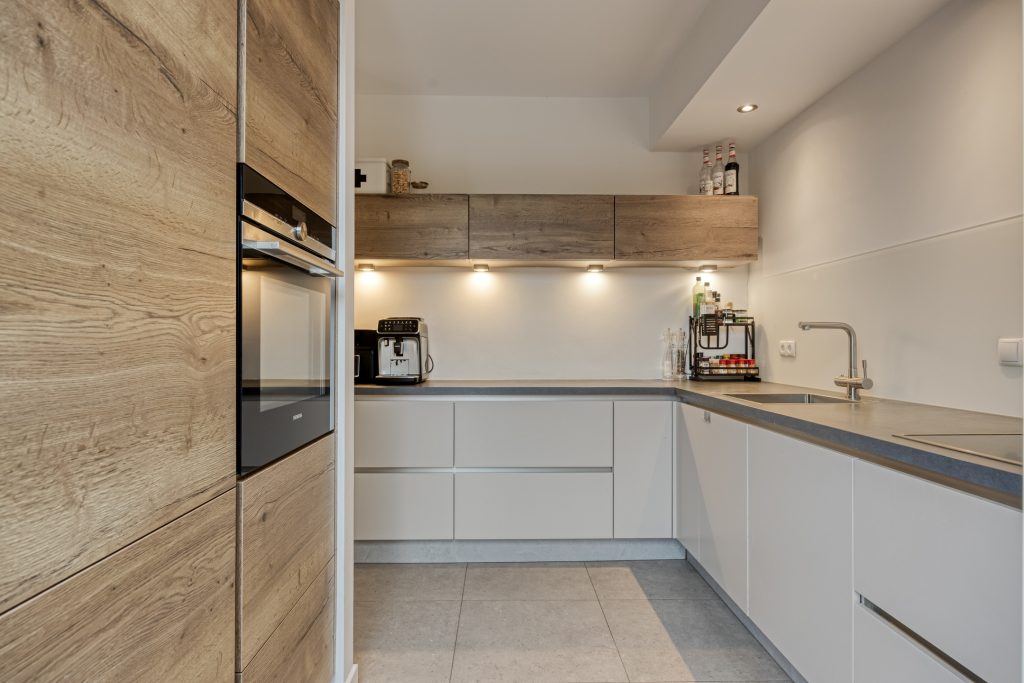 De halfopen luxe en moderne keuken (2019) beschikt over een tegelvloer. De keukeninstallatie in hoek opstelling is voorzien van een kunststof aanrechtblad met spoelbak, 5-pits inductie kookplateau met afzuiging in plafond, koelkast, vriezer, vaatwasser, combi-oven/magnetron en deur naar balkon/terras.