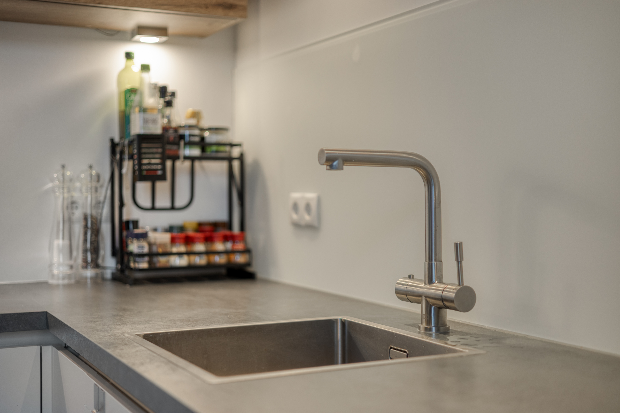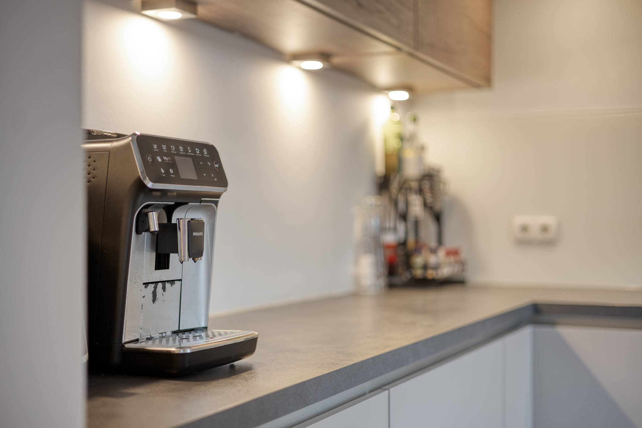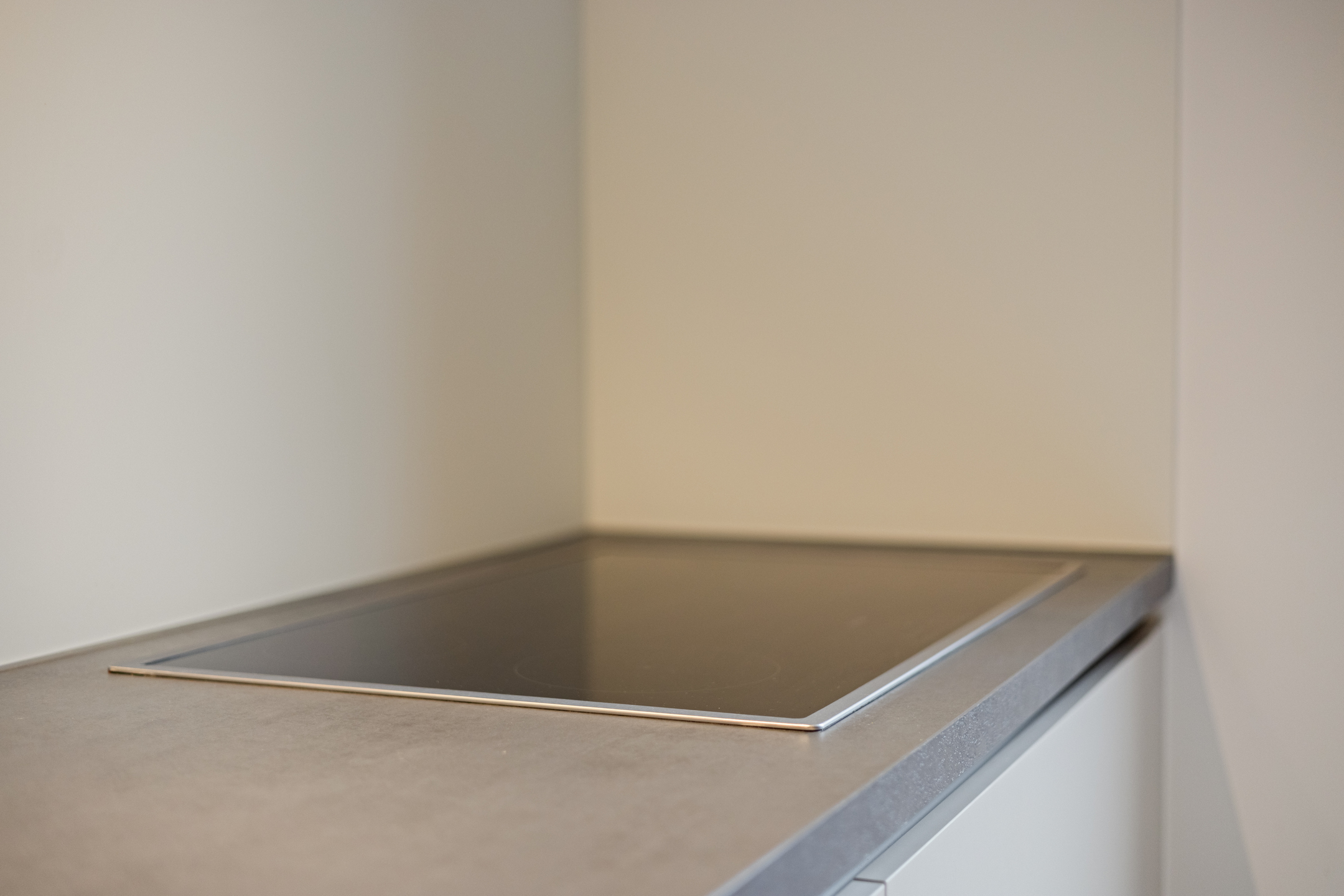 De halfopen luxe en moderne keuken (2019) beschikt over een tegelvloer. De keukeninstallatie in hoek opstelling is voorzien van een kunststof aanrechtblad met spoelbak, 5-pits inductie kookplateau met afzuiging in plafond, koelkast, vriezer, vaatwasser, combi-oven/magnetron en deur naar balkon/terras.
