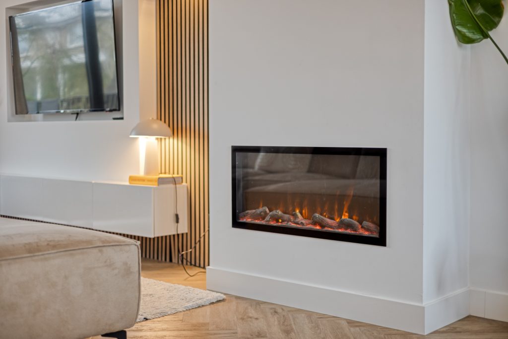 Very spacious, inviting, and bright L-shaped living room with the lounge area located at the rear of the living room, featuring a very cozy electric fireplace (flue still intact), air conditioning (2023), and a folding sliding door that also provides direct access to the cozy, spacious, partially covered balcony/terrace with a sun canopy. You can enjoy spring early here. The spacious balcony/terrace features an extra storage room and stairs to the back garden.