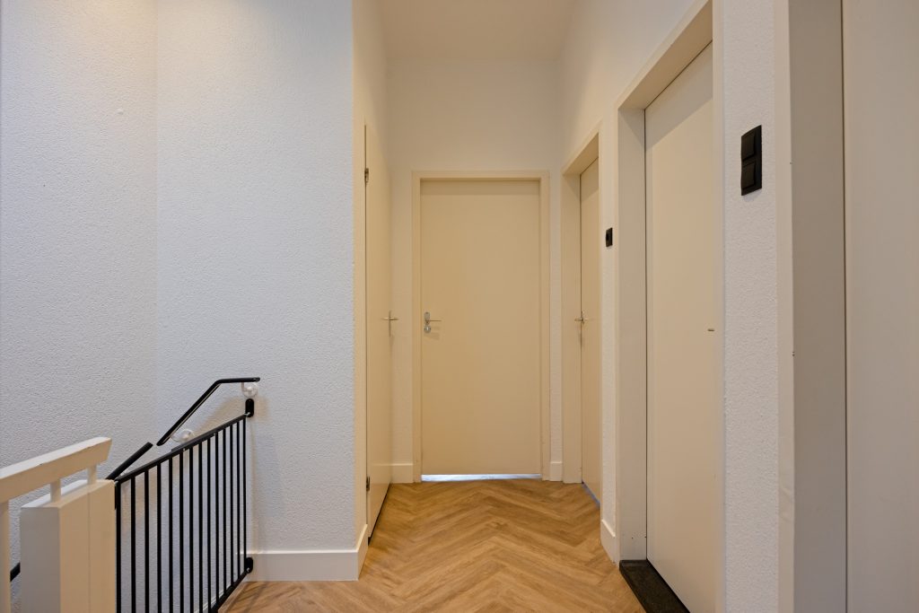 Landing with access to the toilet and living room. This entire floor has a herringbone PVC floor. Luxuriously finished, fully marble-tiled toilet with a wall-hung toilet and small sink.