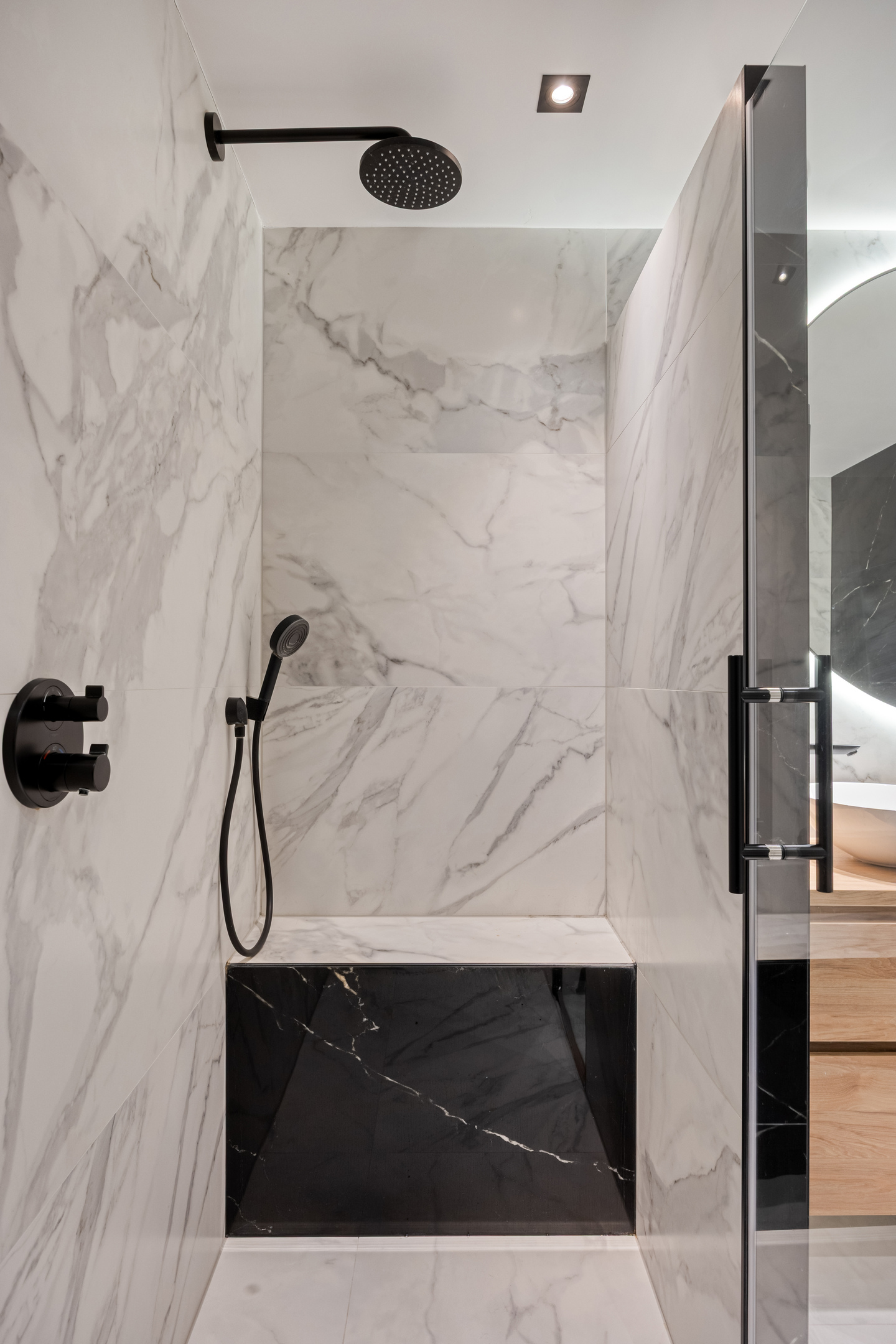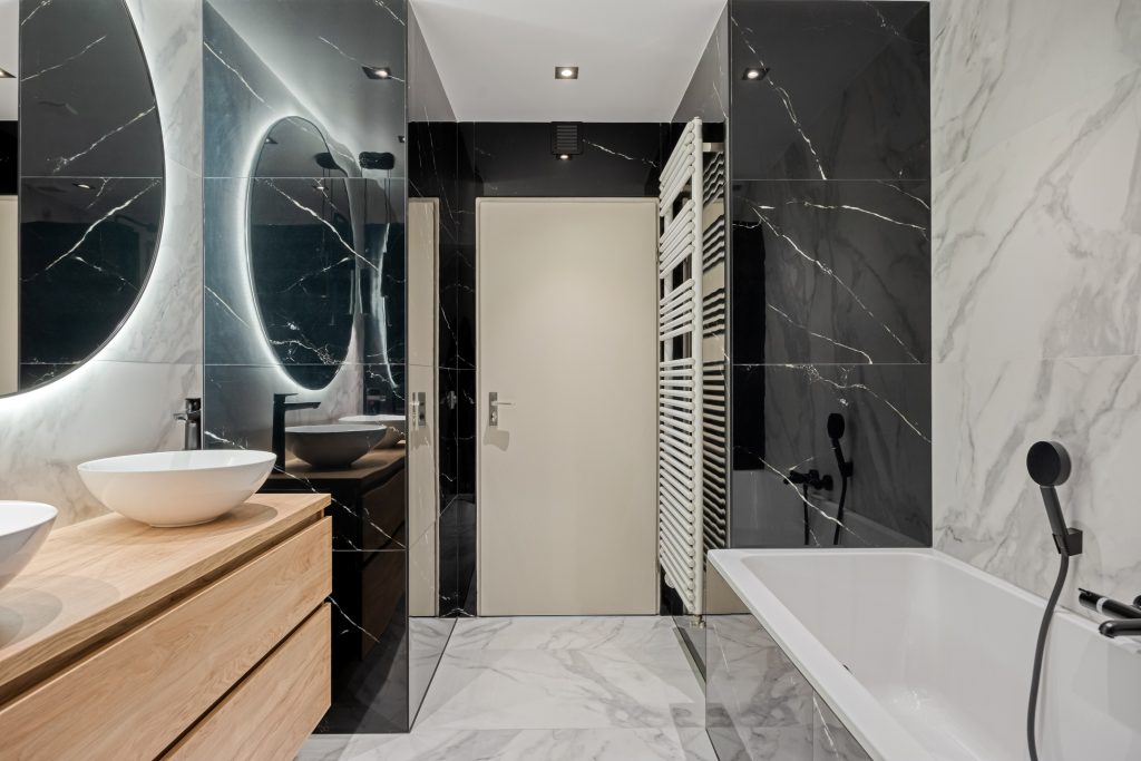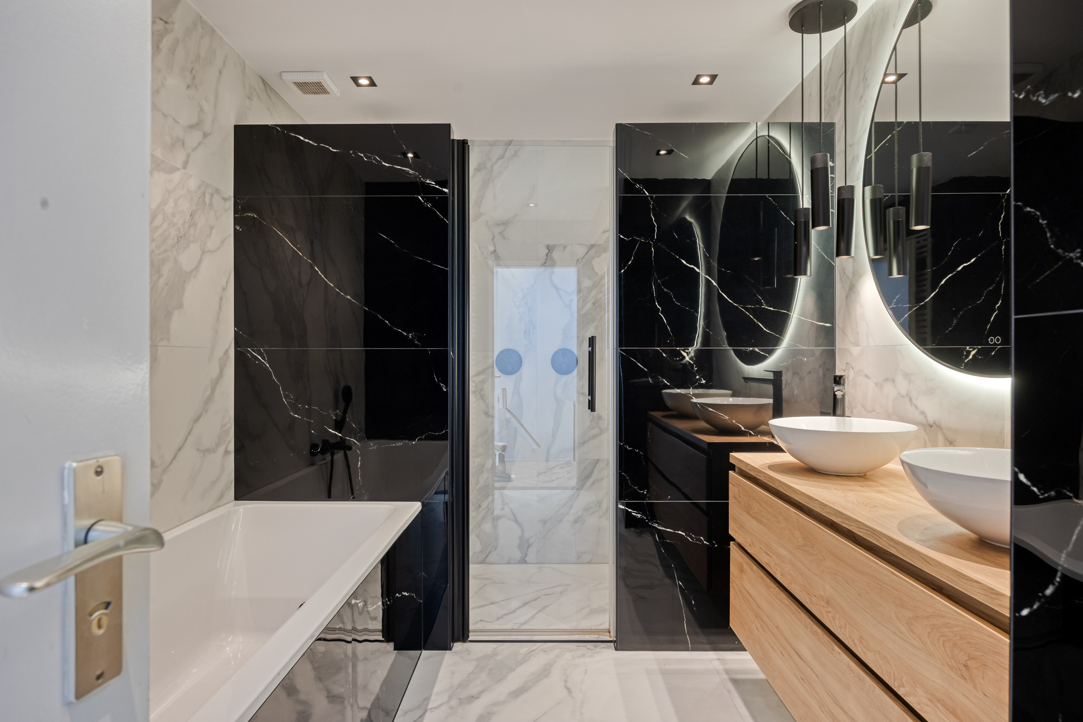 Luxuriously finished, fully marble-tiled bathroom with a double vanity, spacious walk-in shower, bathtub, designer radiator, and mechanical ventilation.