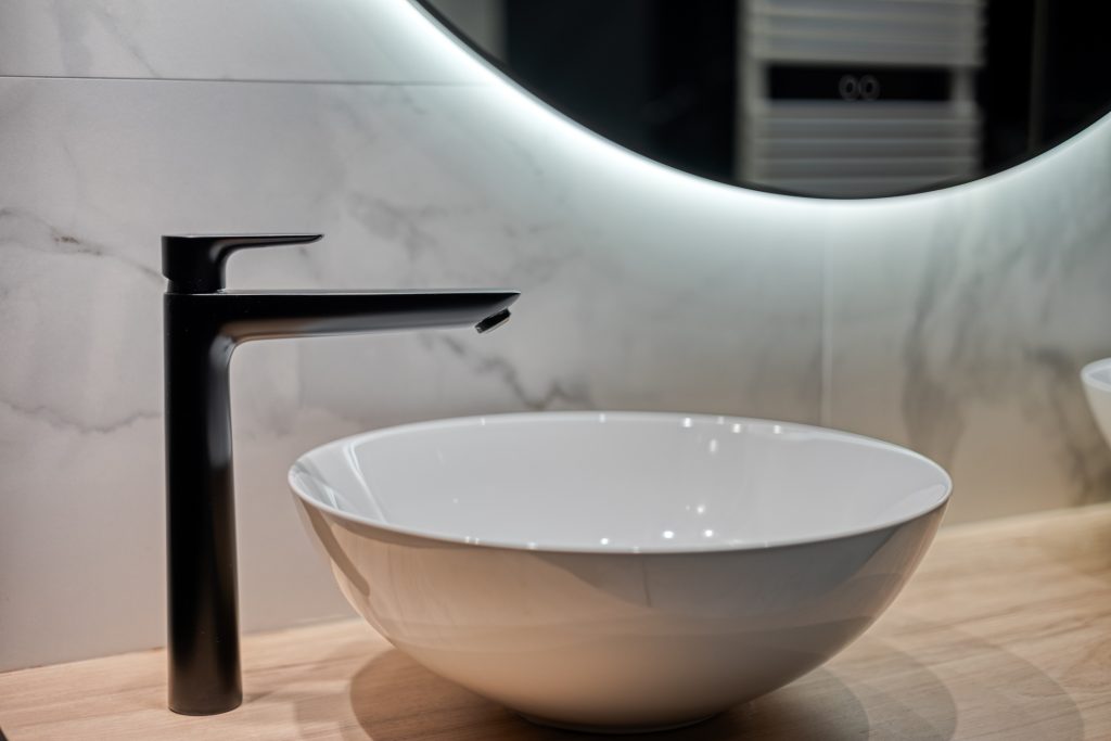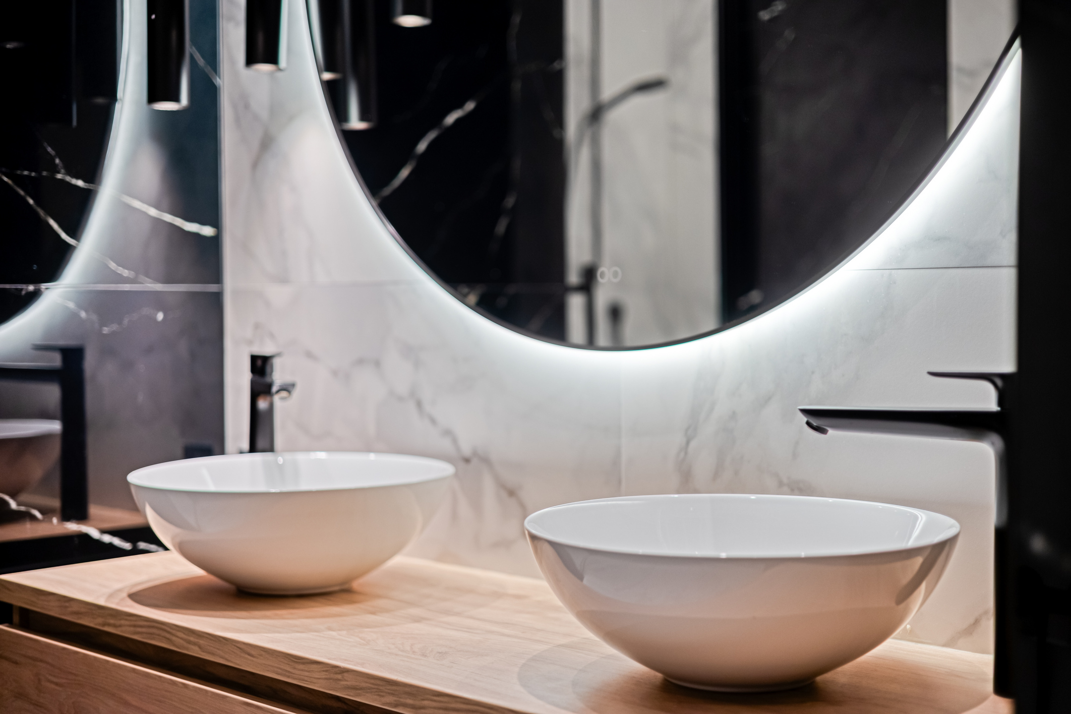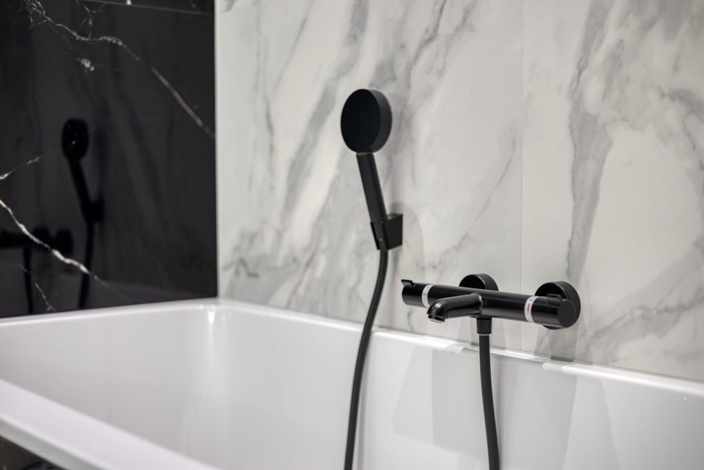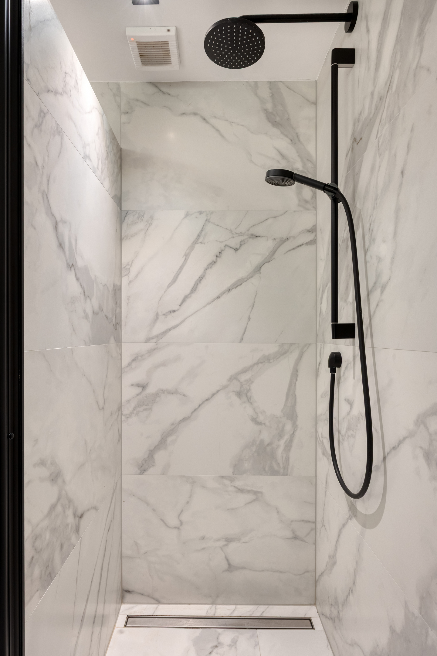 Luxuriously finished, fully marble-tiled bathroom with a double vanity, spacious walk-in shower, bathtub, designer radiator, and mechanical ventilation.