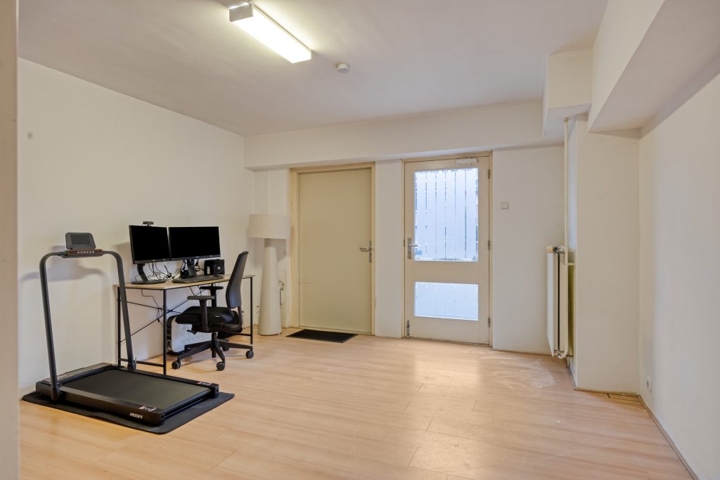 Eveneens een multifunctionele ruimte/kamer aan de voorzijde (voorheen garage) met laminaatvloer en 2 deuren naar de oprit aan de voorzijde. Hier kan men dus heel gemakkelijk een toegang hebben voor een praktijkruimte of kantoor aan huis.
