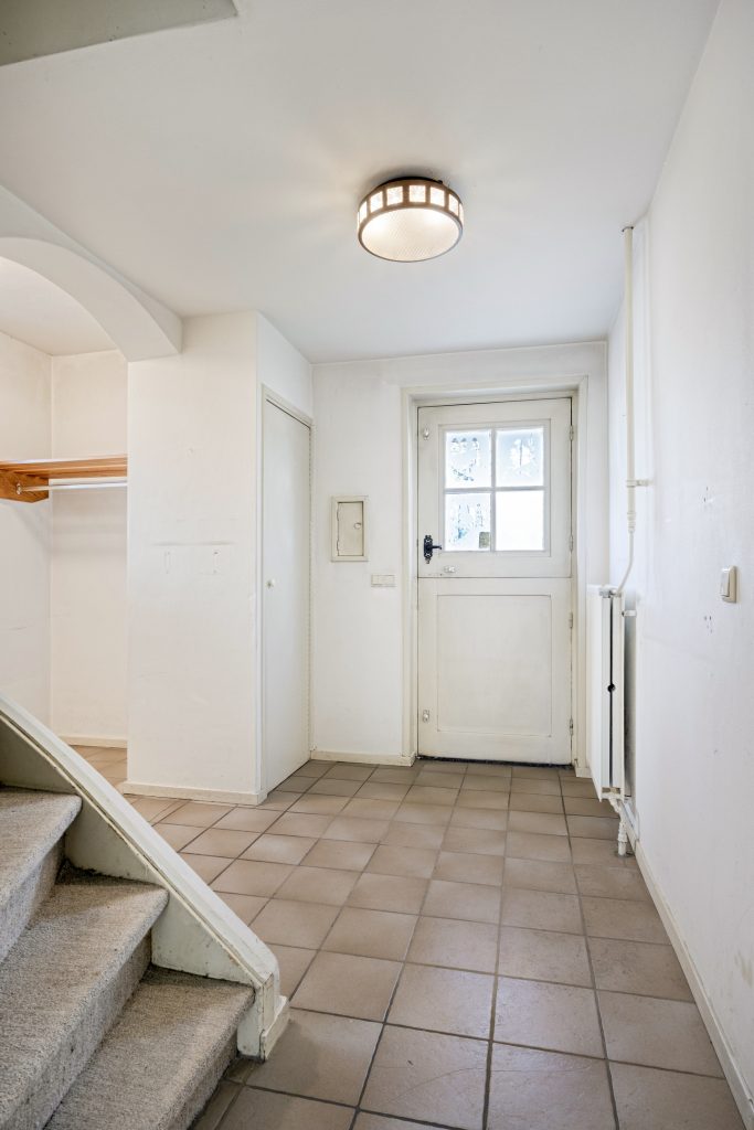 Wide front garden with mature planting and space for multiple cars. A wide path runs alongside the house to the garage and the garden. At the front door is a covered entrance, which provides access to a spacious hall with a tiled floor, wardrobe, meter cupboard, and toilet with a washbasin. The staircase to the first floor is located in the hall, with a practical storage cellar underneath.