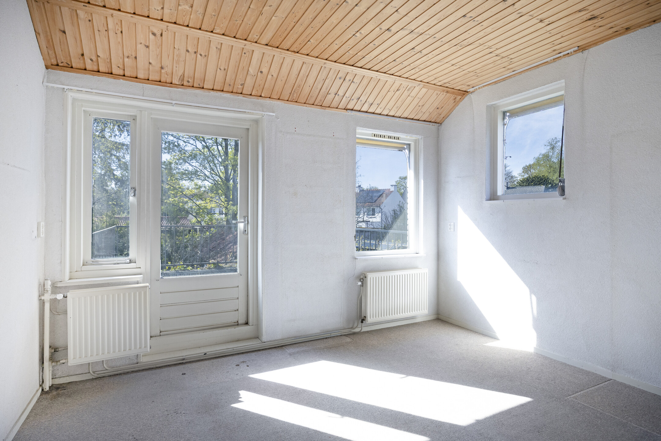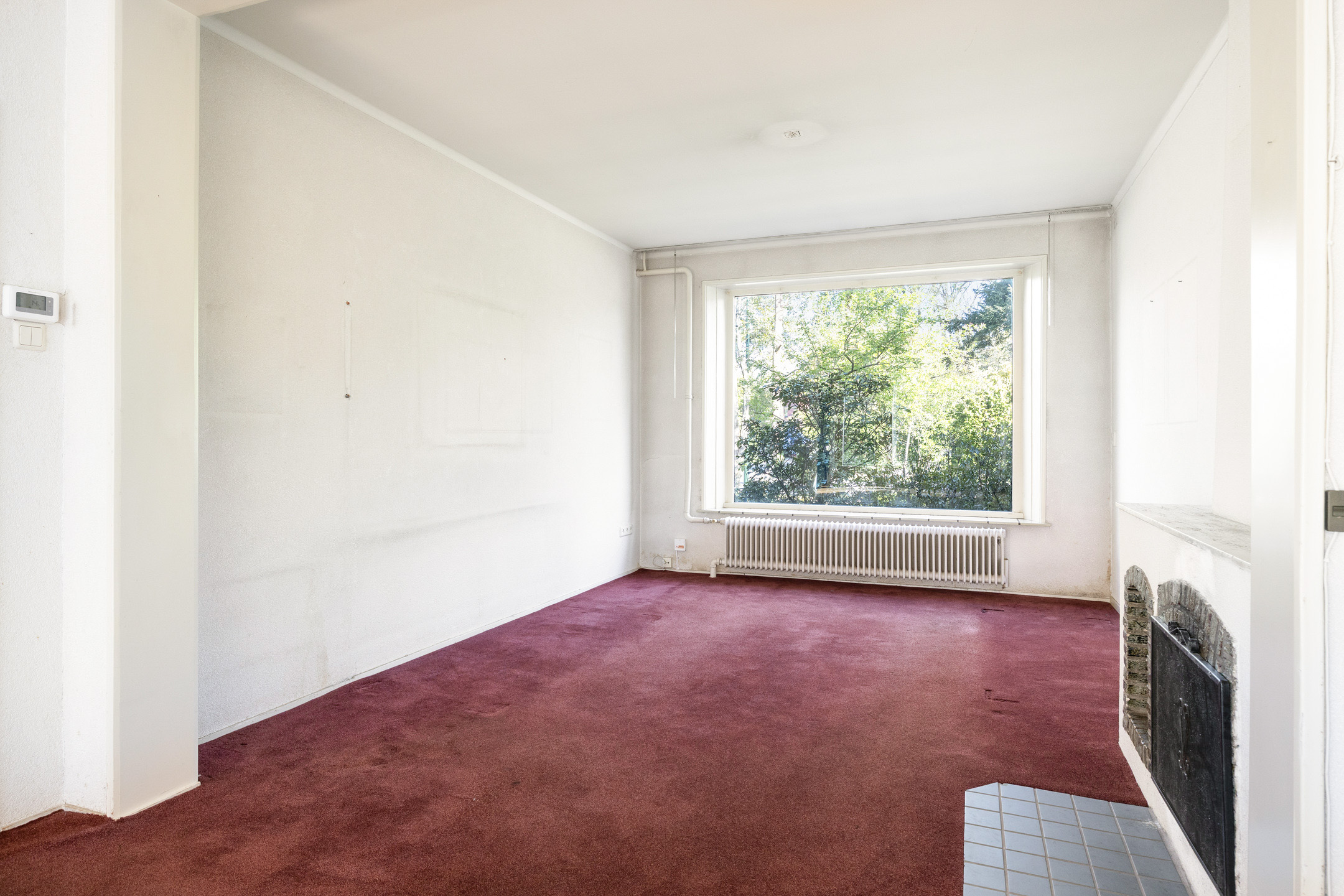 The generous living room, with windows on both sides, features an atmospheric fireplace, beautiful natural light, and a lovely view of the garden through the large windows. A door from the room provides access to a sun terrace and the back garden.