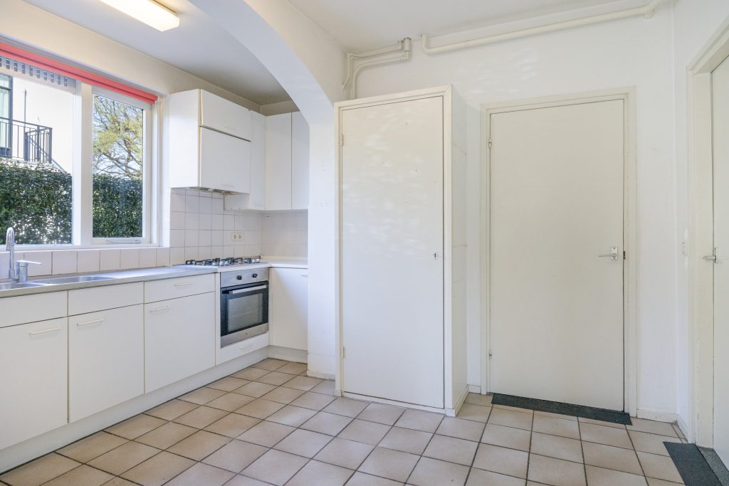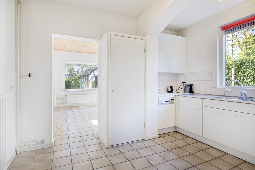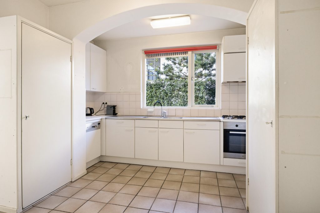Vanuit de hal is ook de keuken bereikbaar, een fijne ruimte met twee grote inbouwkasten en een groot raam, dat zorgt voor een mooie lichtinval. Vanuit de keuken bereikt men zowel de woonkamer als de ruime tuinkamer.