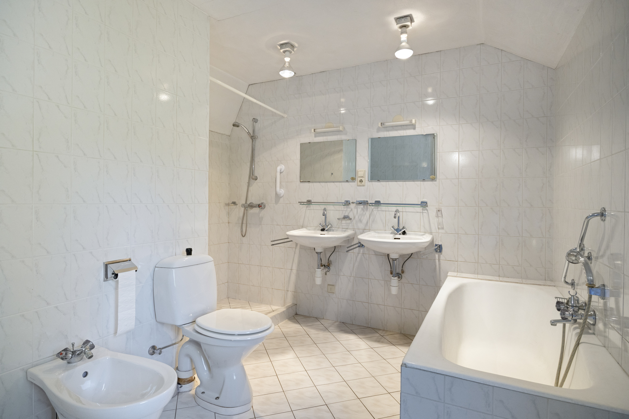 Ruime, betegelde badkamer voorzien van ligbad, separate inloopdouche, 2 wastafels, bidet en toilet.