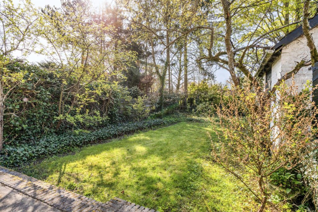 Prachtige, groene achtertuin met veel privacy. Aangenaam zonneterras, gazon en diverse volwassen beplantingen, gesitueerd op het zuiden.