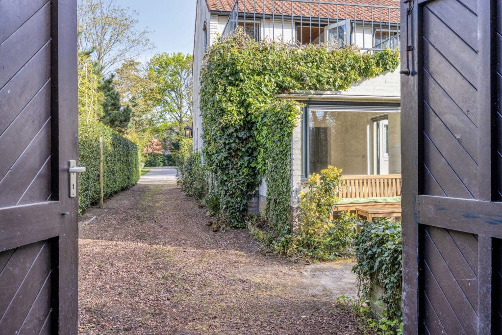 Brede voortuin met volwassen beplanting en plek voor meerdere auto’s. Langs het huis loopt een breed pad naar de garage en de tuin. Bij de voordeur is een overdekte entree, die toegang biedt tot een ruime hal met plavuizen vloer, garderobe, meterkast en toilet met fonteintje. In de hal bevindt zich de trapopgang naar de eerste verdieping met daaronder een praktische provisiekelder.