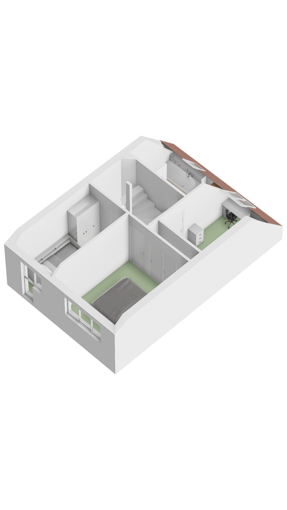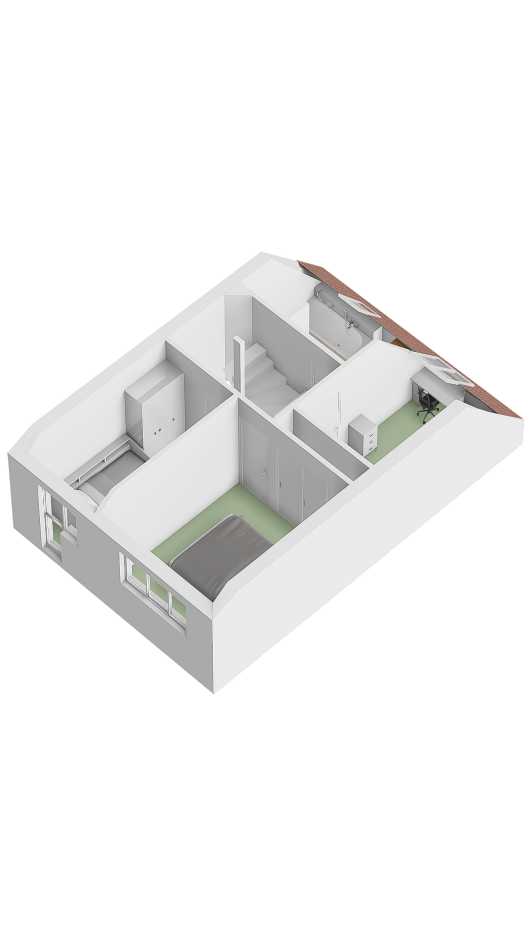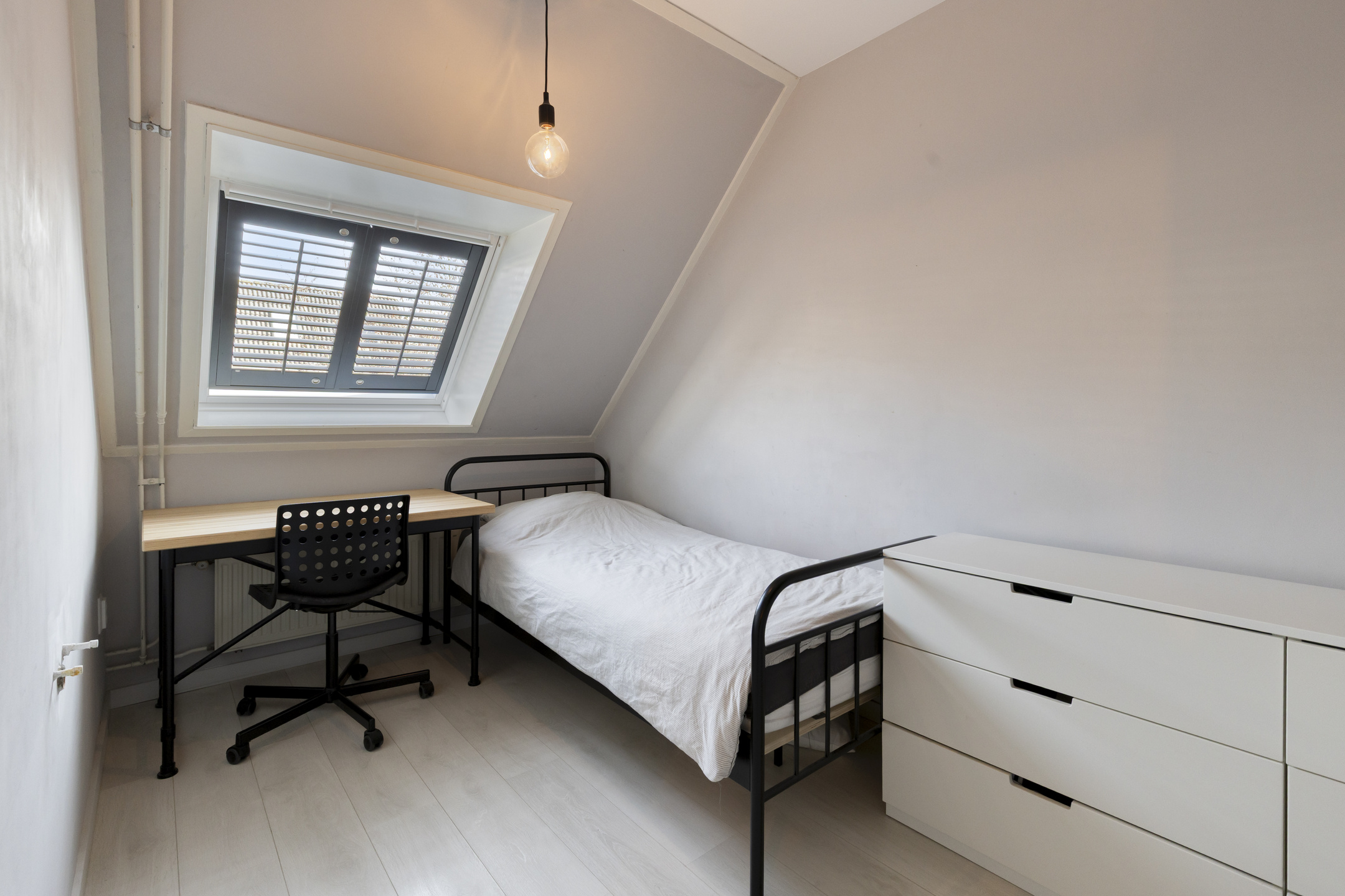 Slaapkamer 3 aan de achterzijde met laminaatvloer, stucwerk wandafwerking en dakraam met shutters.