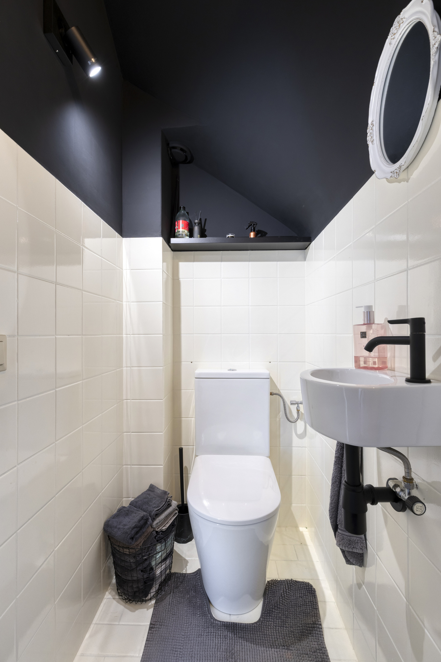 Entrance with oak parquet flooring, plastered wall finish, and meter cupboard. Partially tiled toilet with washbasin. Atmospheric L-shaped living room with parquet flooring and plastered wall finish.