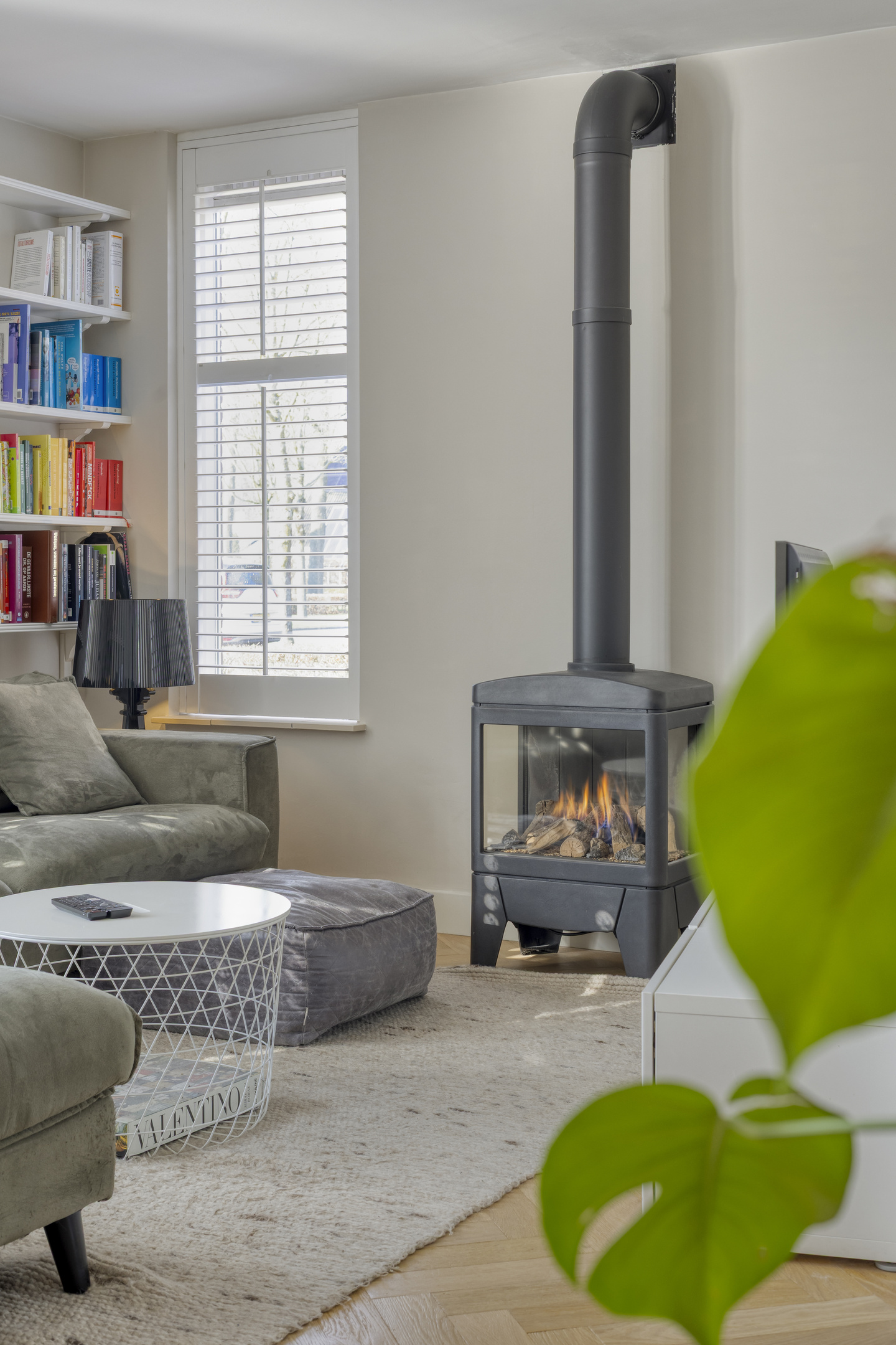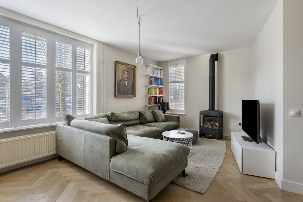 Zitgedeelte aan de voorzijde met gashaard, grote raampartijen met vrij uitzicht, voorzien van shutters.