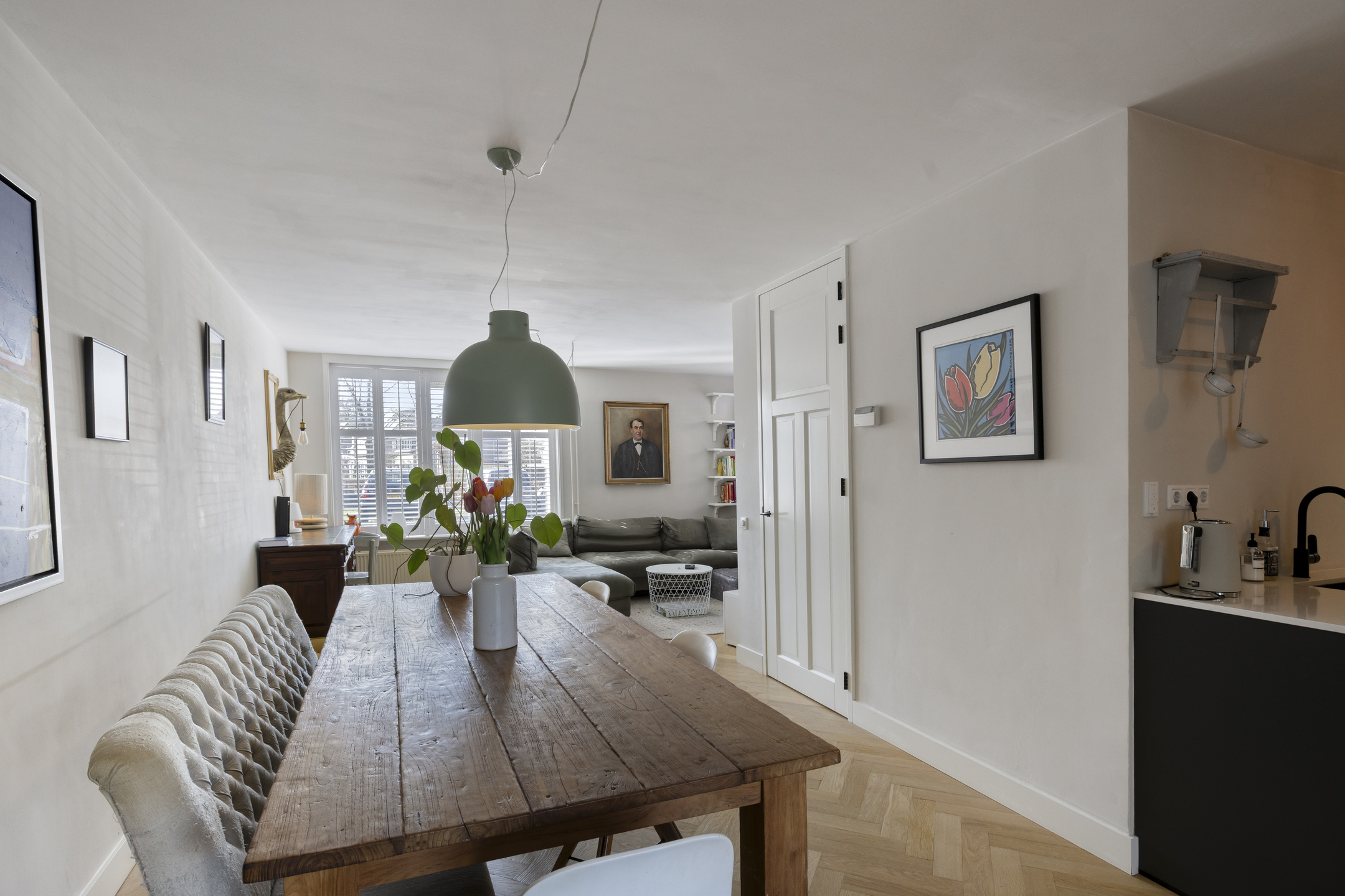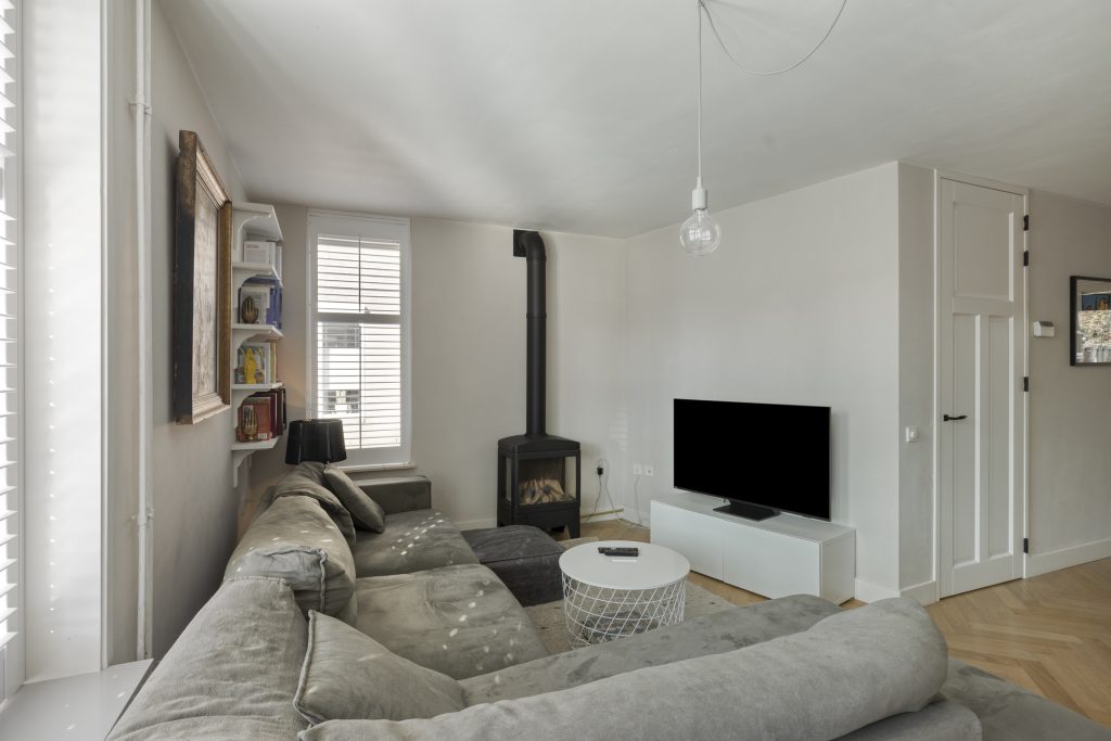 Entree met eikenhouten parketvloer, stucwerk wandafwerking en meterkast. Deels betegeld toilet met fonteintje. Sfeervolle L-vormige woonkamer met parketvloer en stucwerk wandafwerking.
