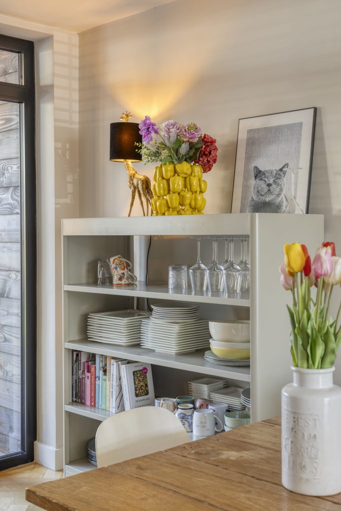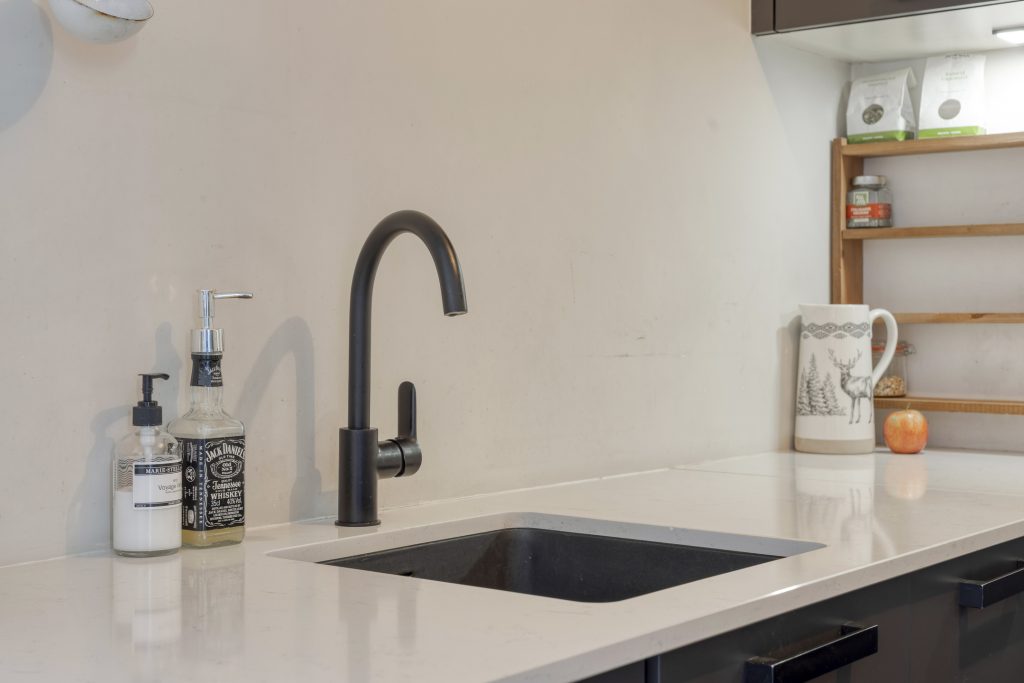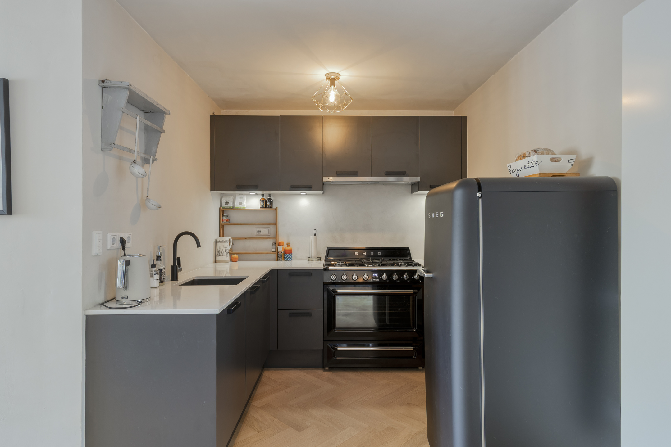 Open keuken aan de achterzijde met L-vormige keukenopstelling met een composiet aanrechtblad met spoelbak, Smeg 5-pits gaskookplateau met XL oven, afzuigkap, vaatwasser en veel onder en bovenkasten.