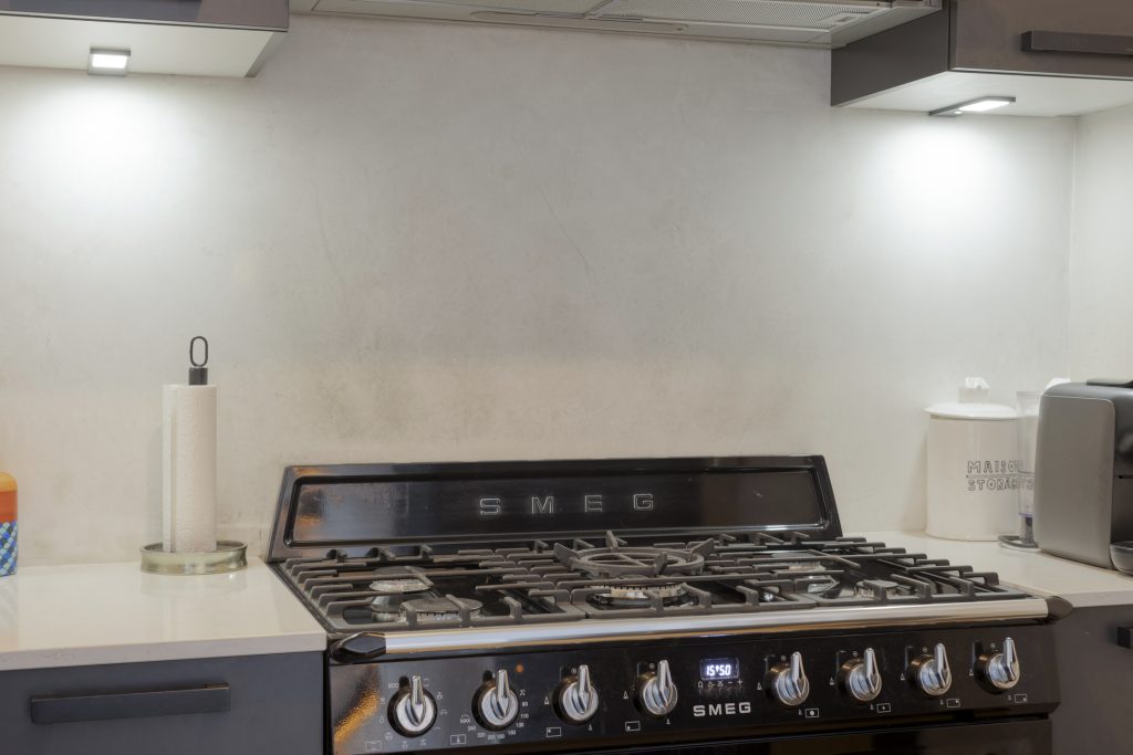 Open kitchen at the rear with an L-shaped kitchen layout featuring a composite countertop with sink, Smeg 5-burner gas hob with XL oven, extractor hood, dishwasher, and ample upper and lower cabinets.