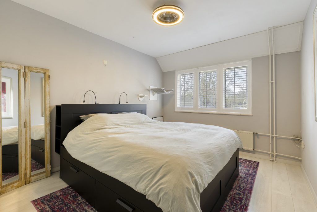 Slaapkamer 1 aan de voorzijde met laminaatvloer, kunststof kozijn met screen (2014) en stucwerk wandafwerking. De ramen zijn hier voorzien van shutters.