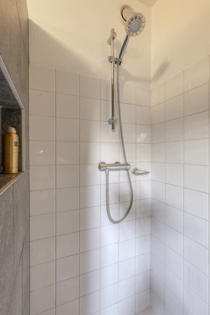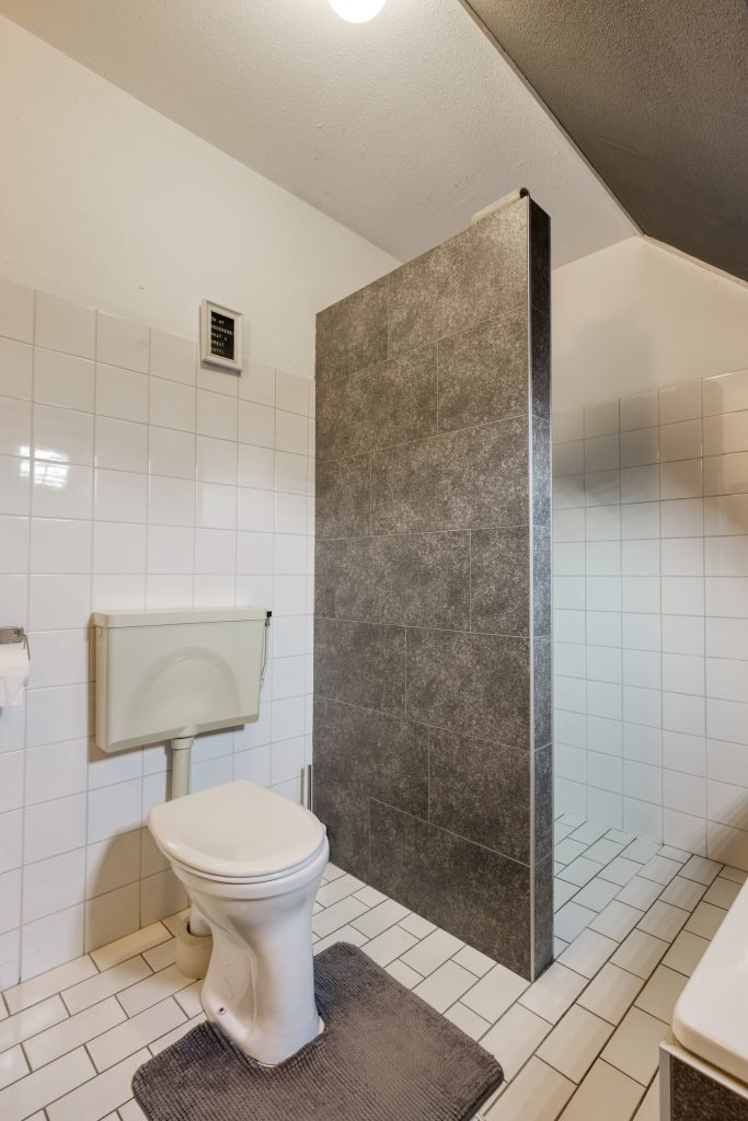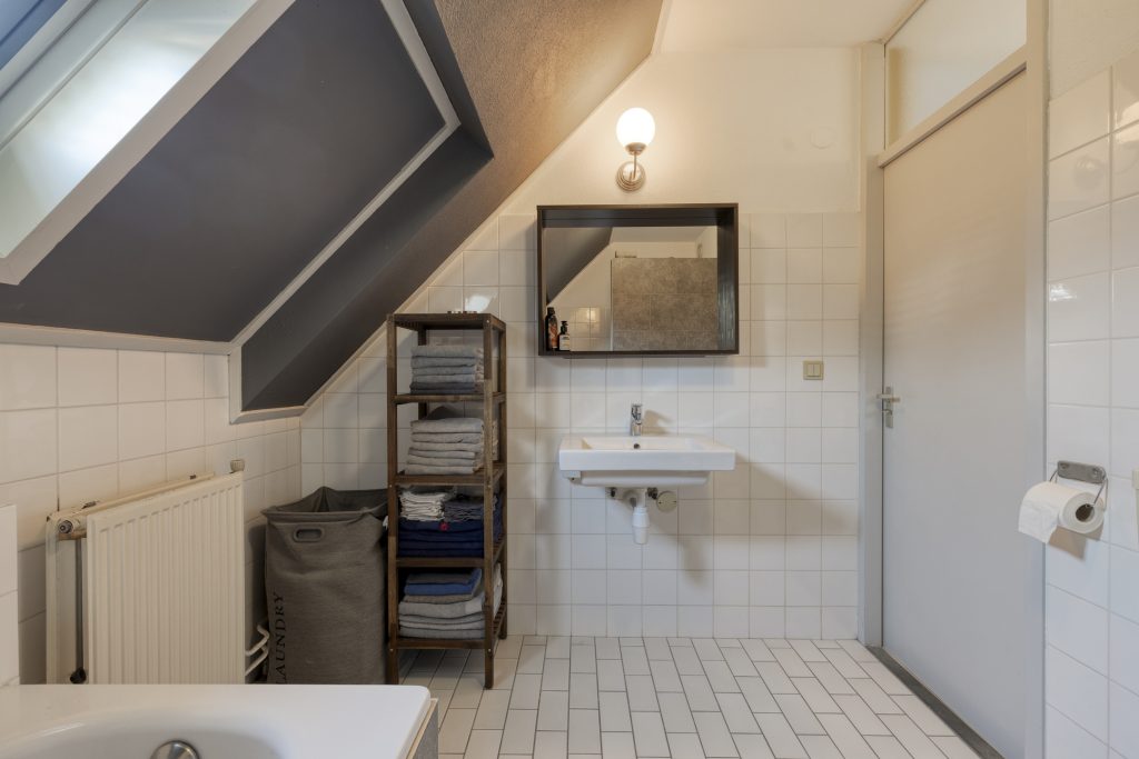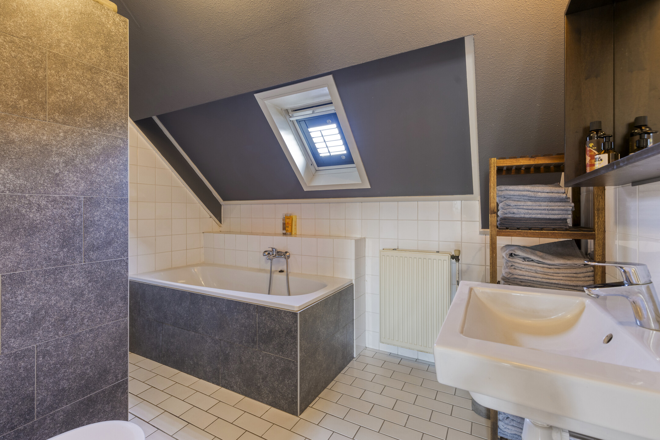 Badkamer (gemoderniseerd in 2013) voorzien van ligbad, inloopdouche, wastafel, toilet en Velux dakraam met shutters.