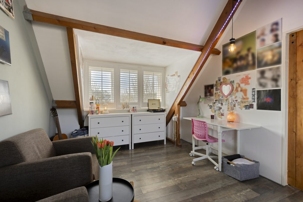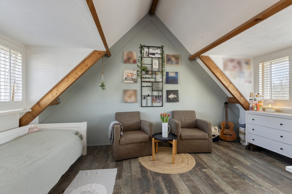 Ruime zolderkamer met dakkapel aan de voor- en achterzijde met eveneens een laminaatvloer en veel bergruimte onder de kapschuinte.