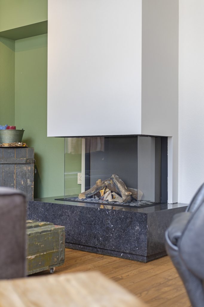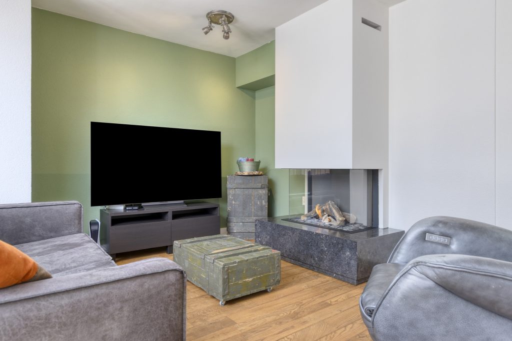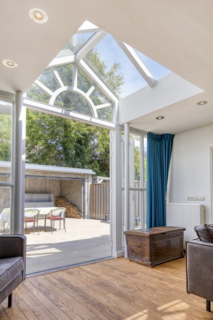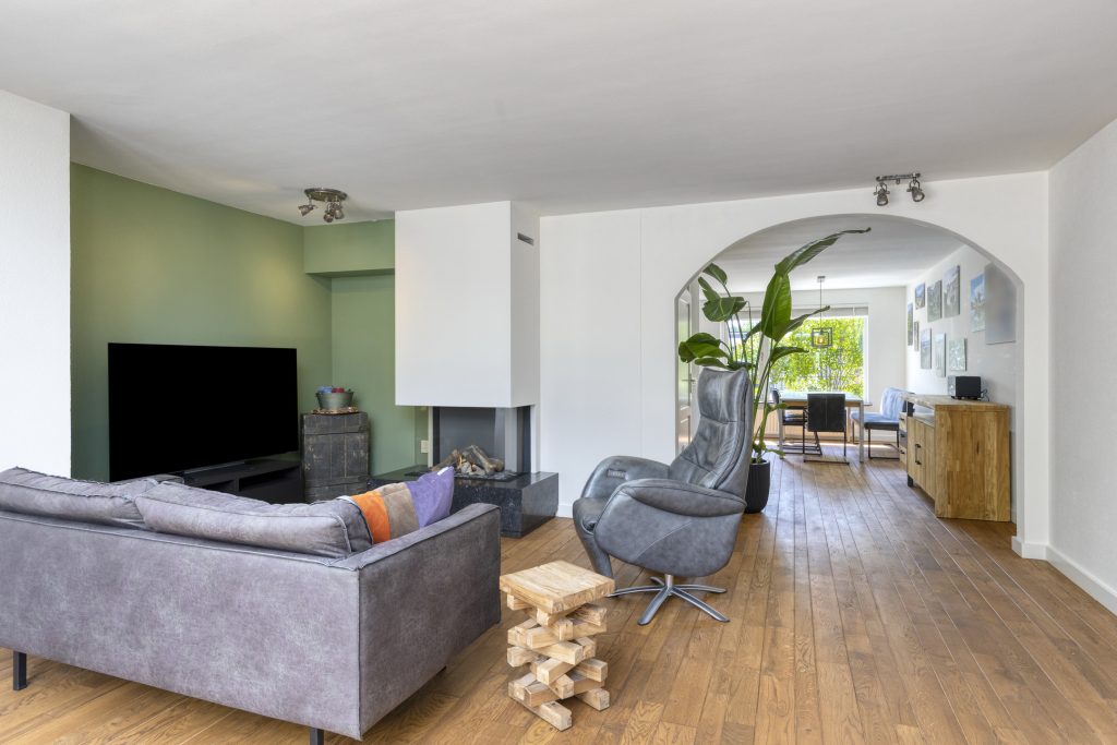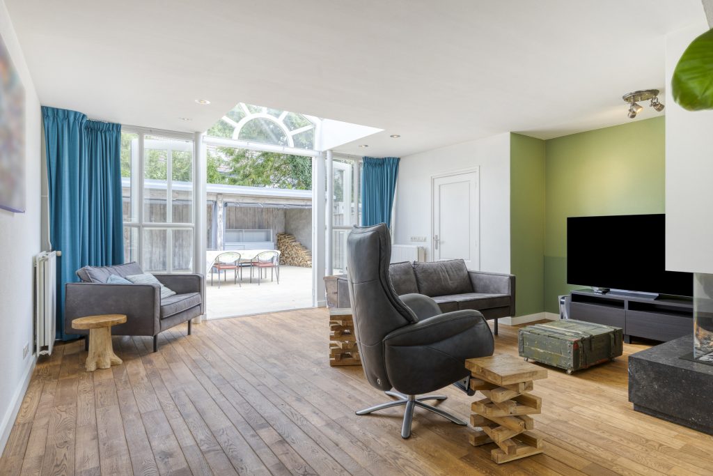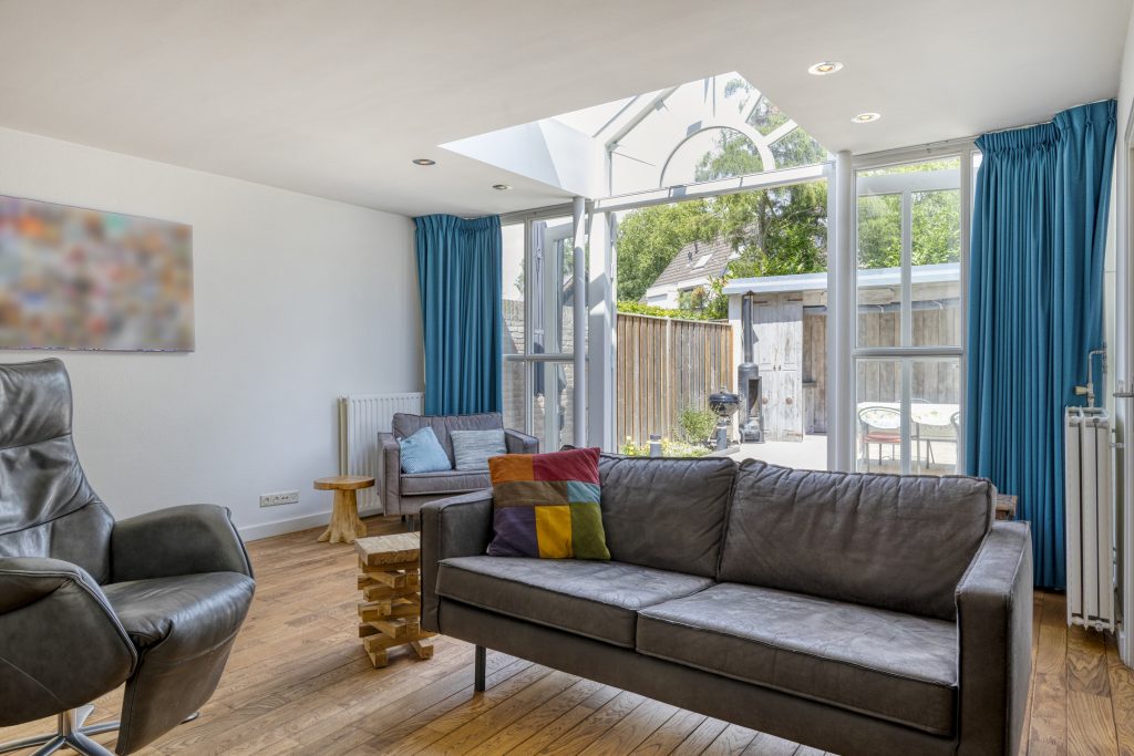 Gezellig uitgebouwd zitgedeelte aan de achterzijde met gashaard, bijzondere lichtstraat en openslaande tuindeuren naar de achtertuin en deur naar de garage.