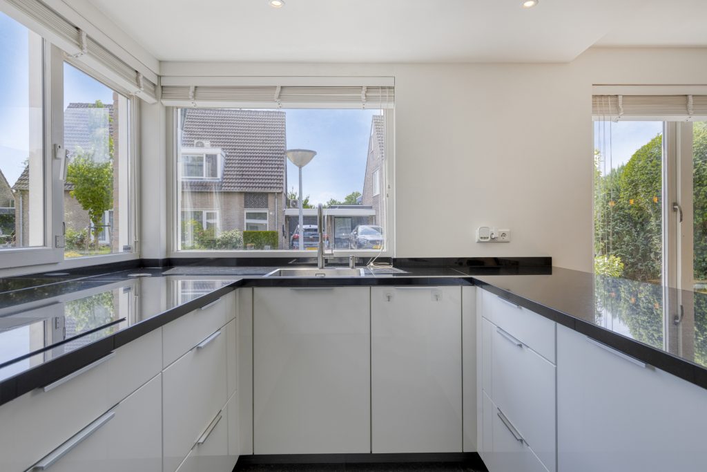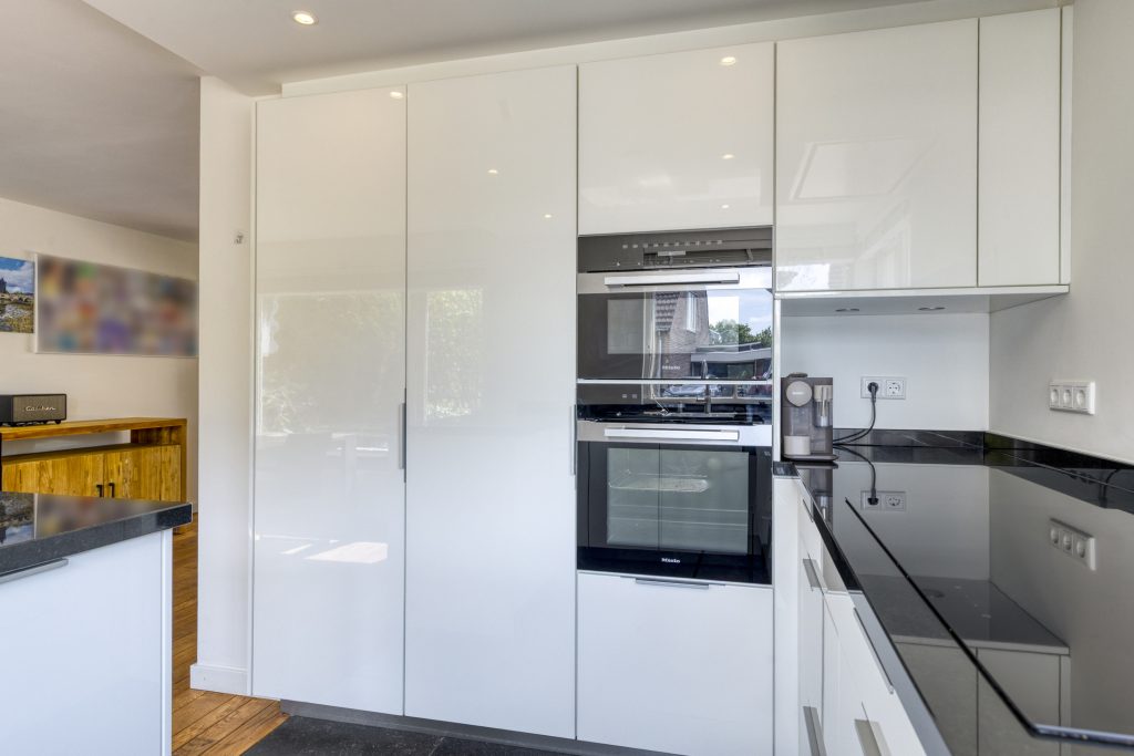 Open keuken in U-opstelling met granieten aanrechtblad met spoelbak, mengkraan en quooker, 5-pits inductie kookplateau (merk Novy in touch) kookplaten met plafond afzuiging , oven en magnetron, vaatwasser (allen Miele) en koelkast (Liebherr). Veel onder en bovenkasten. Men geniet hier van veel werkruimte vanwege het U-vormige aanrechtblad.