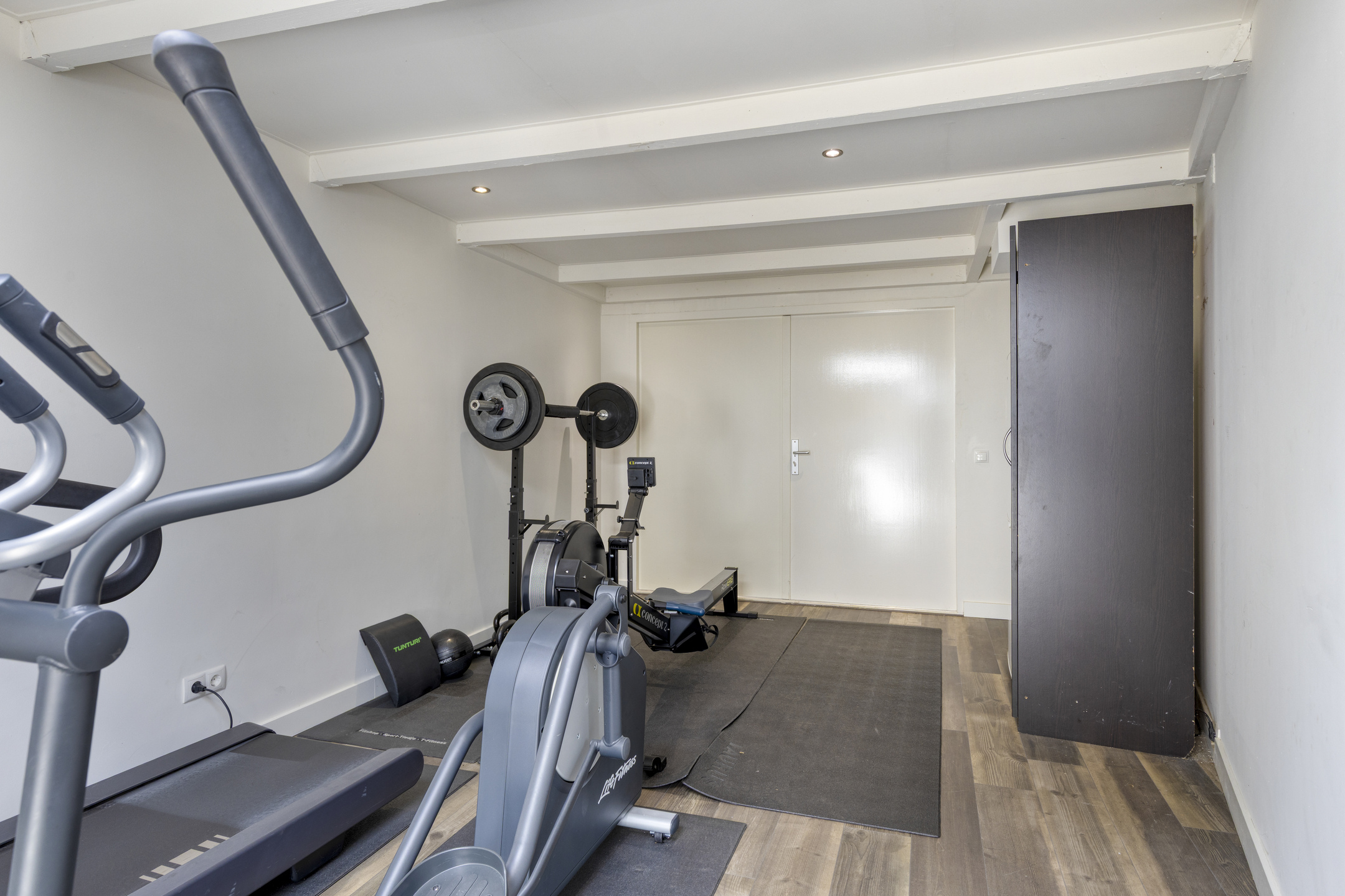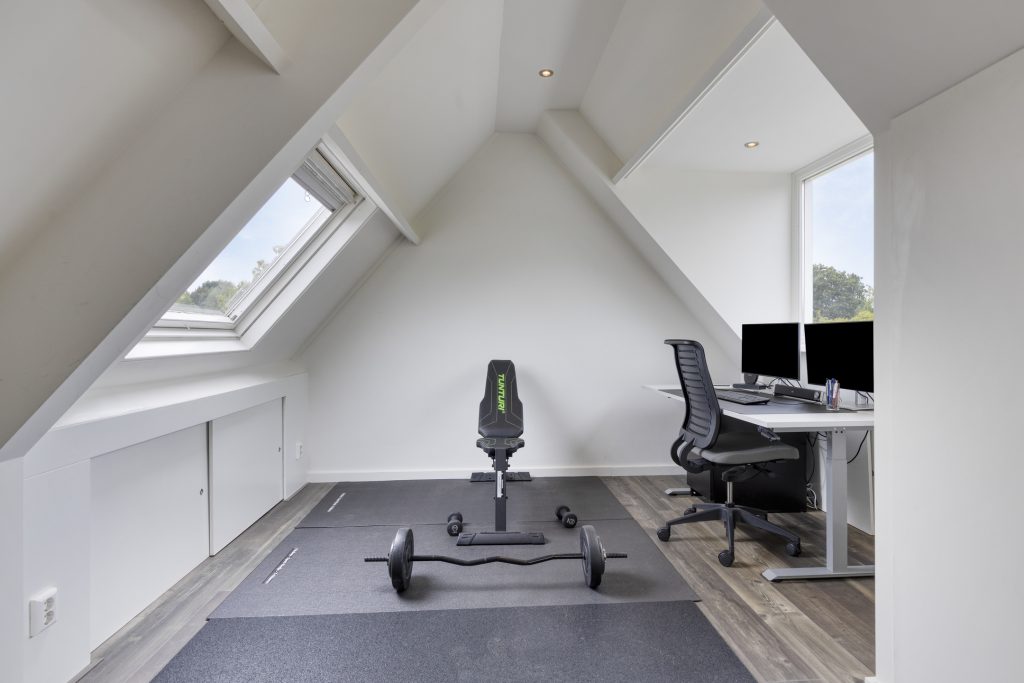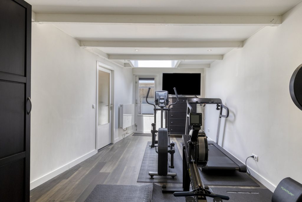 De garage, voorzien van een PVC-vloer, is nu in gebruik als sport/fitnessruimte en heeft openslaande deuren naar de oprit, een lichtkoepel, verwarming, inbouwspots in het plafond en een deur naar de achtertuin.