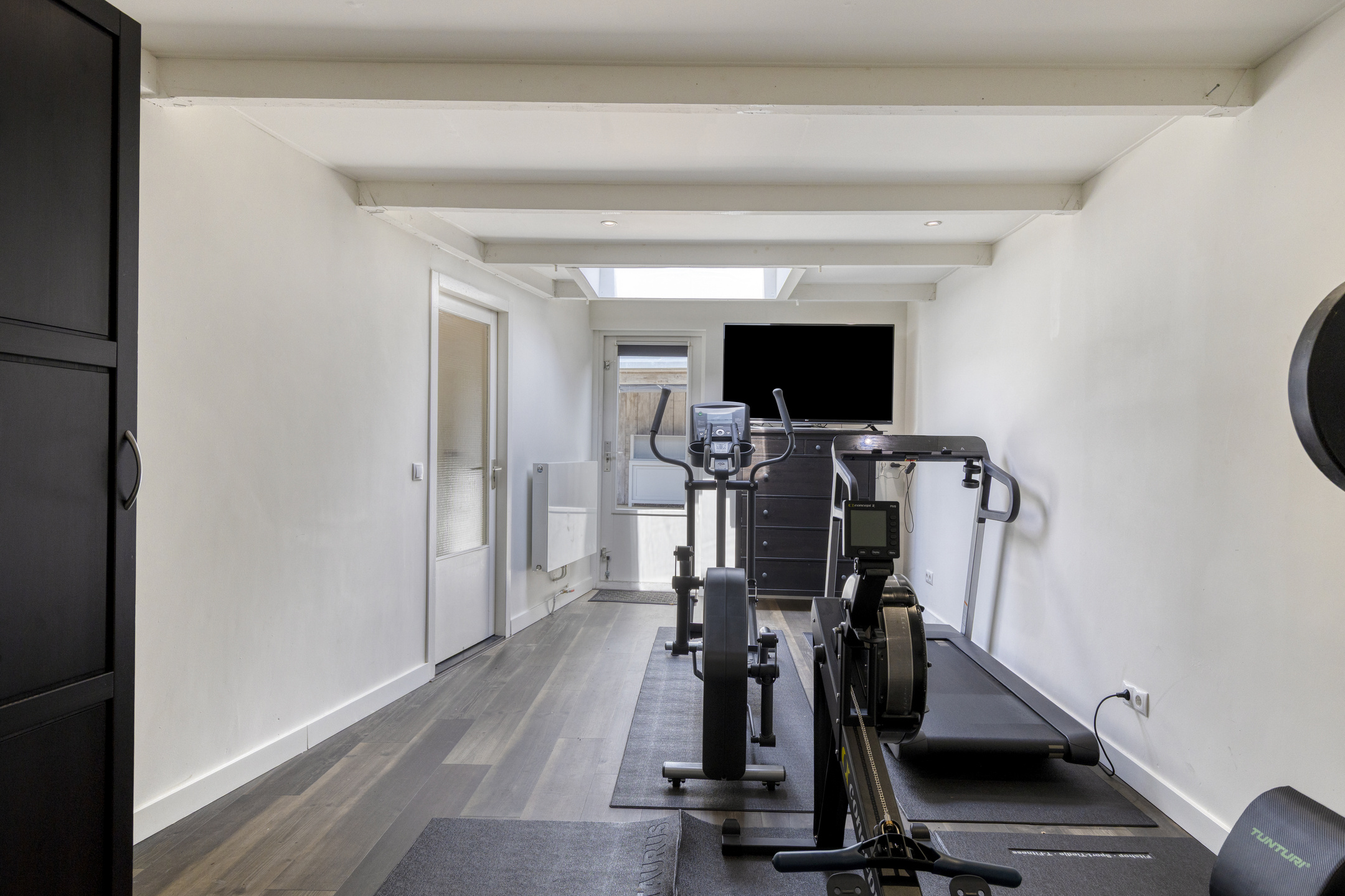 The garage, with a PVC floor, is currently used as a sports/fitness room and features French doors leading to the driveway, a skylight, heating, recessed ceiling spotlights, and a door to the back garden.