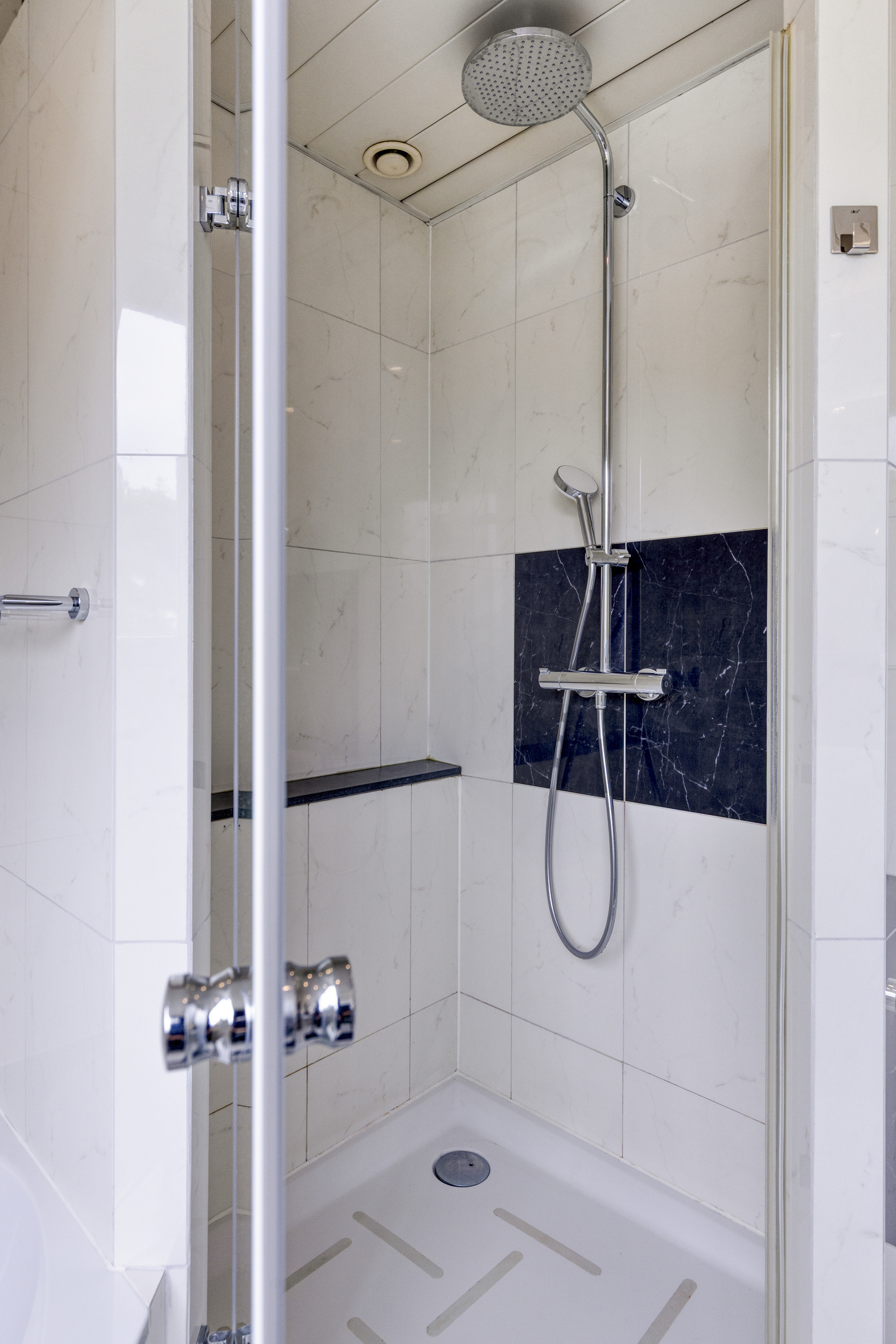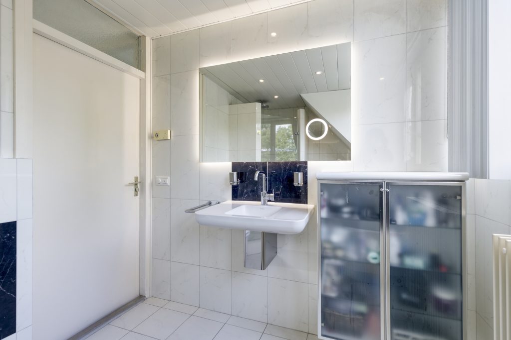 Geheel betegelde badkamer voorzien van mechanische ventilatie, met ligbad, douche, toilet, wastafel , en wandmeubel met spiegel en verlichting.