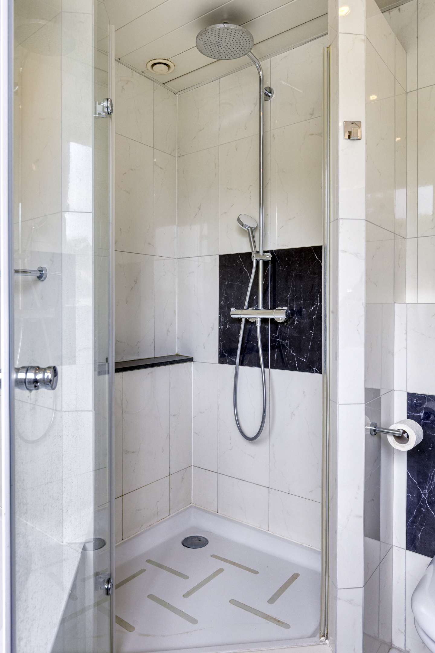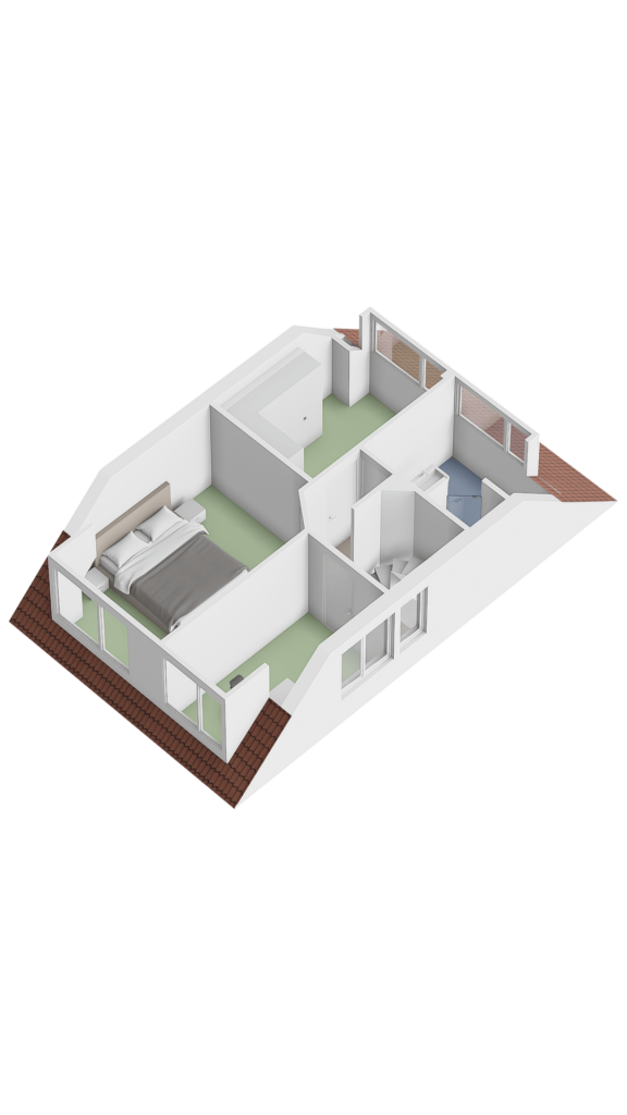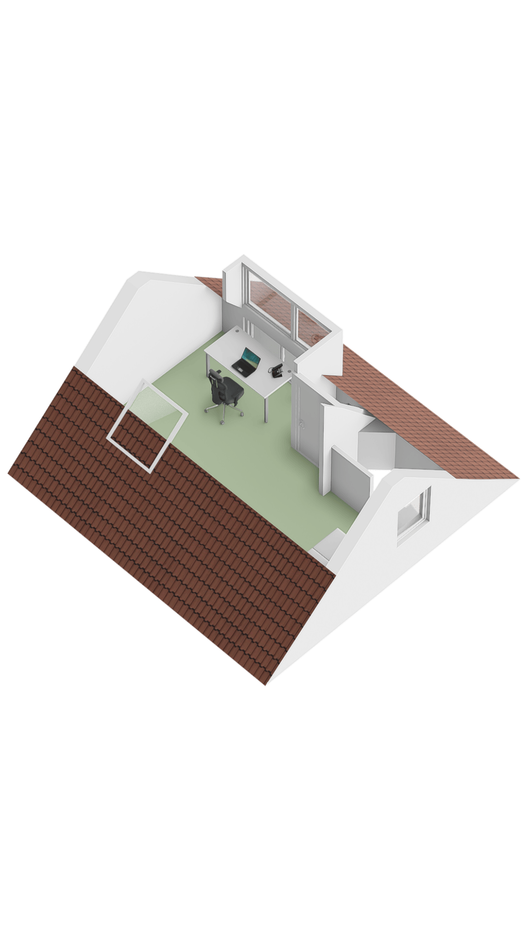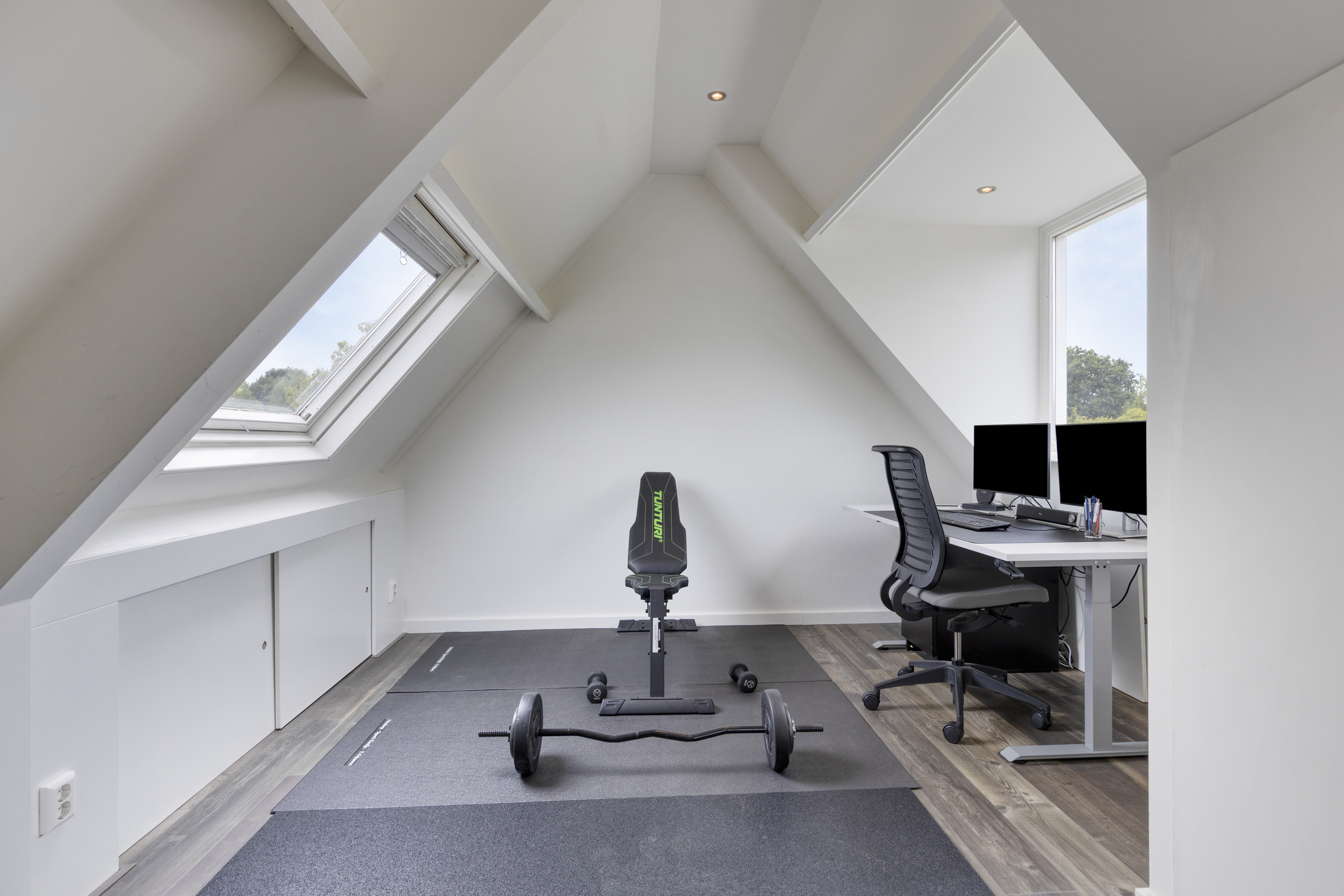 Vloer is een houtlook PVC-vloer en een Velux dakraam aan de voorzijde en nog een zijraam.