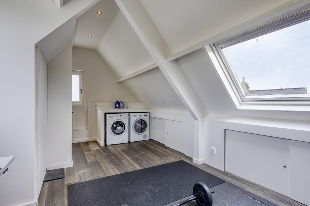 Open zolderverdieping met slaapkamer 4 met aansluiting wasmachine, dakkapel aan de achterzijde en veel bergruimte onder kapschuinte aan weerszijden. Bergkast met de opstelling CV-installatie (Remeha Tzerra uit 2020).