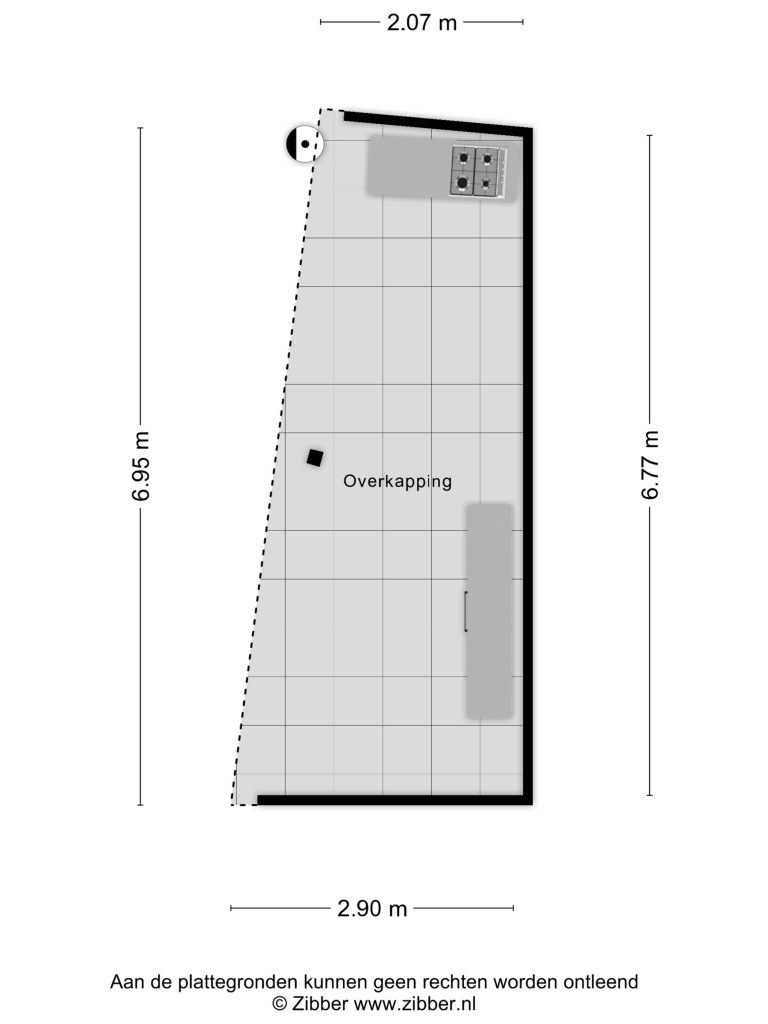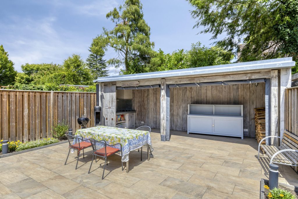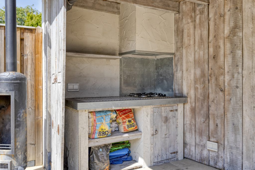 De buitenkeuken heeft een betegeld aanrechtblad, 4-pits gaskookplateau met afzuiging en elektra.