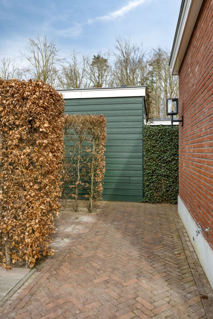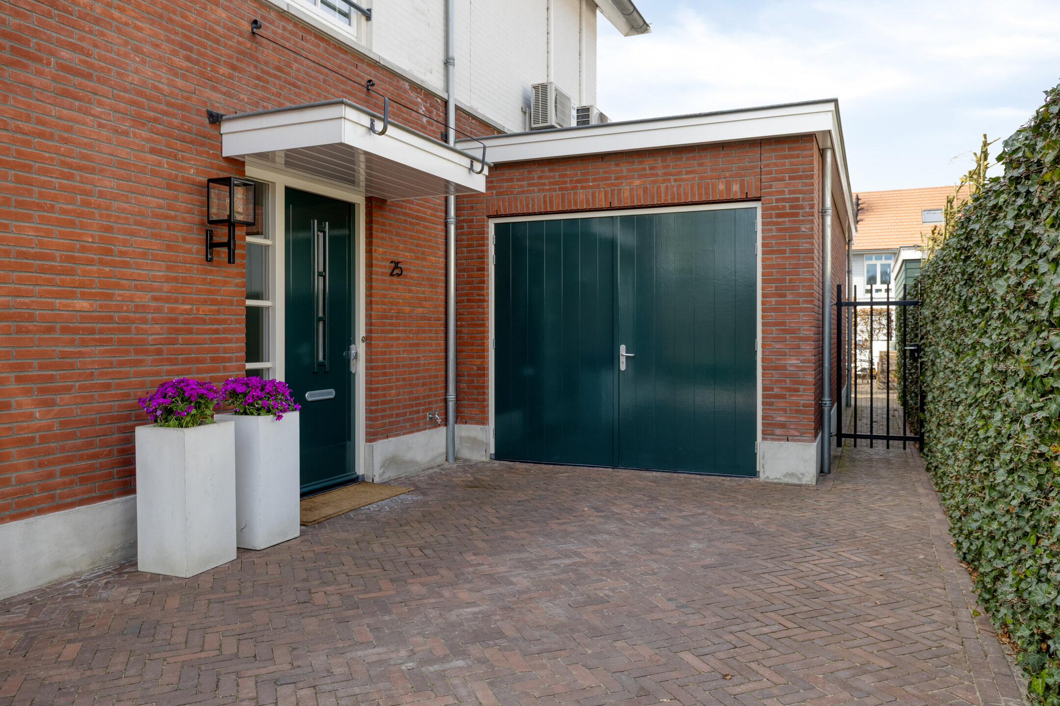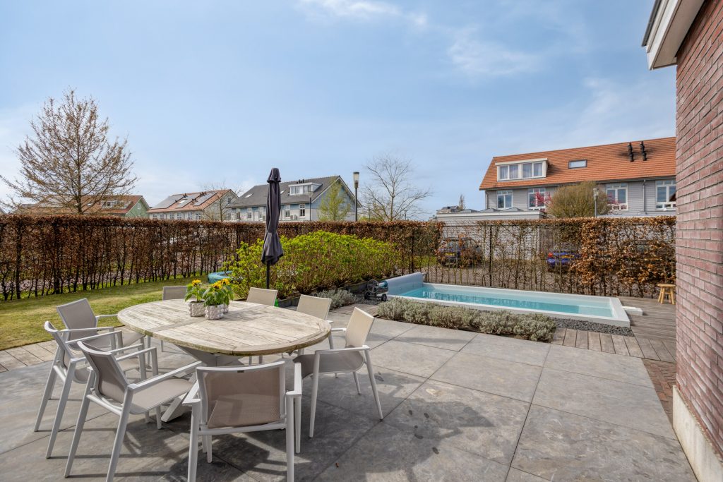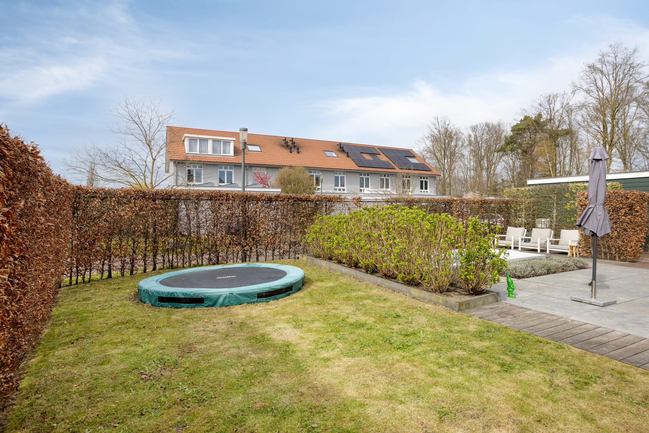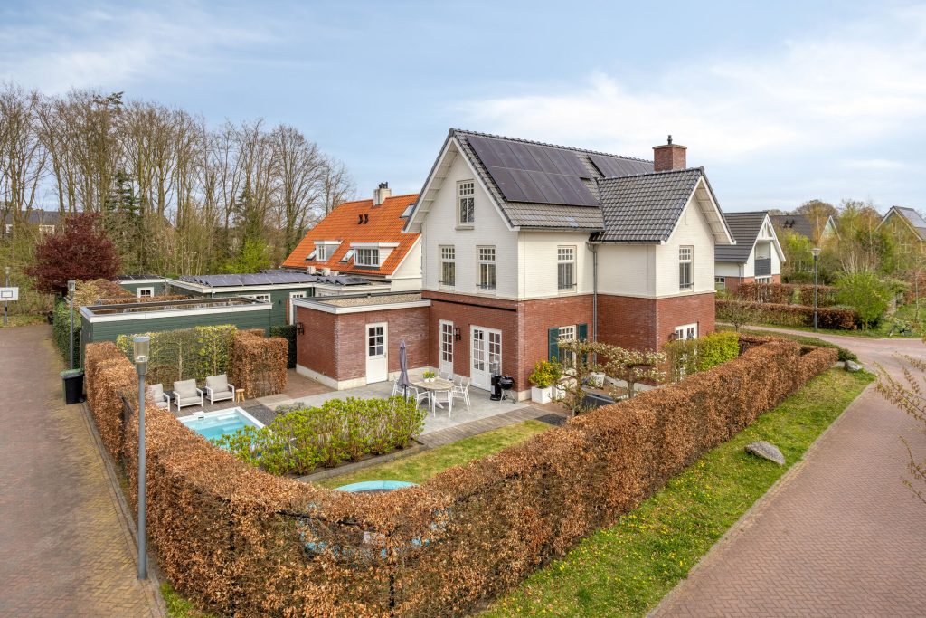 Aan de voorzijde is er een eveneens fraai aangelegde voortuin, oprit voor 2 auto’s, oplaadpunt en deur naar de garage en een achterom met een fraaie poort.