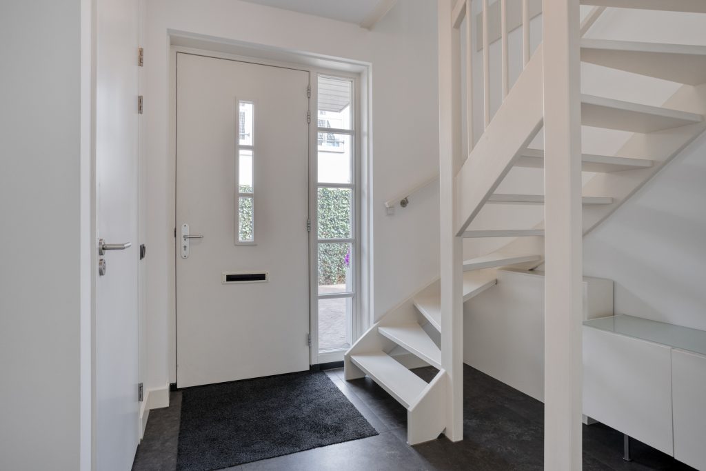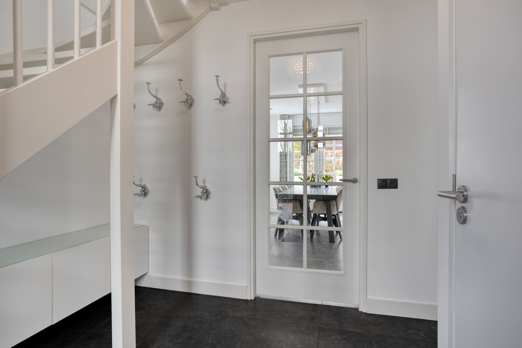 De entree geeft direct een warm welkom met een ruime hal en zicht op de eetkamer. De gehele begane grond is voorzien van een plavuizen vloer met vloerverwarming.
