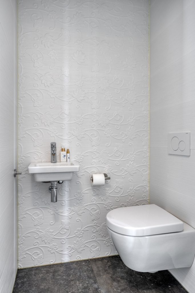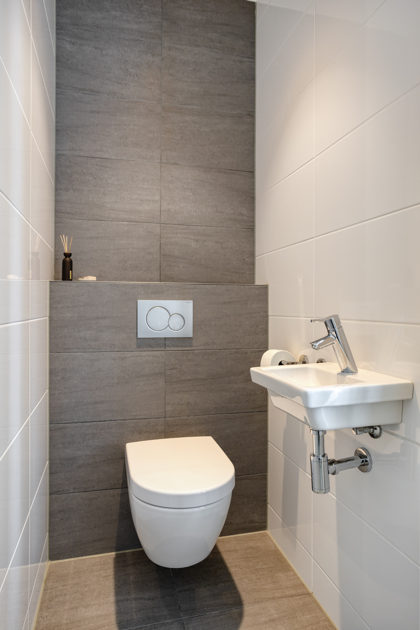 De hal beschikt over de meterkast en het ruime toilet, geheel betegeld met fonteintje.