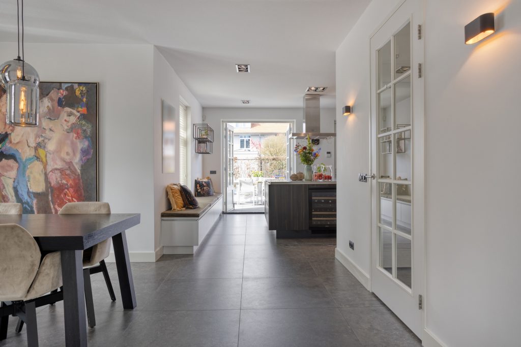 In het midden is het riante eetgedeelte met openslaande tuindeuren naar het zijterras, waar je ook heerlijk kunt genieten van de opkomende zon.